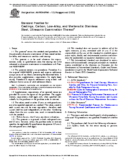1.1 This practice2 covers the standards and procedures for the pulse-echo ultrasonic examination of heat-treated carbon, low-alloy, and martensitic stainless steel castings.