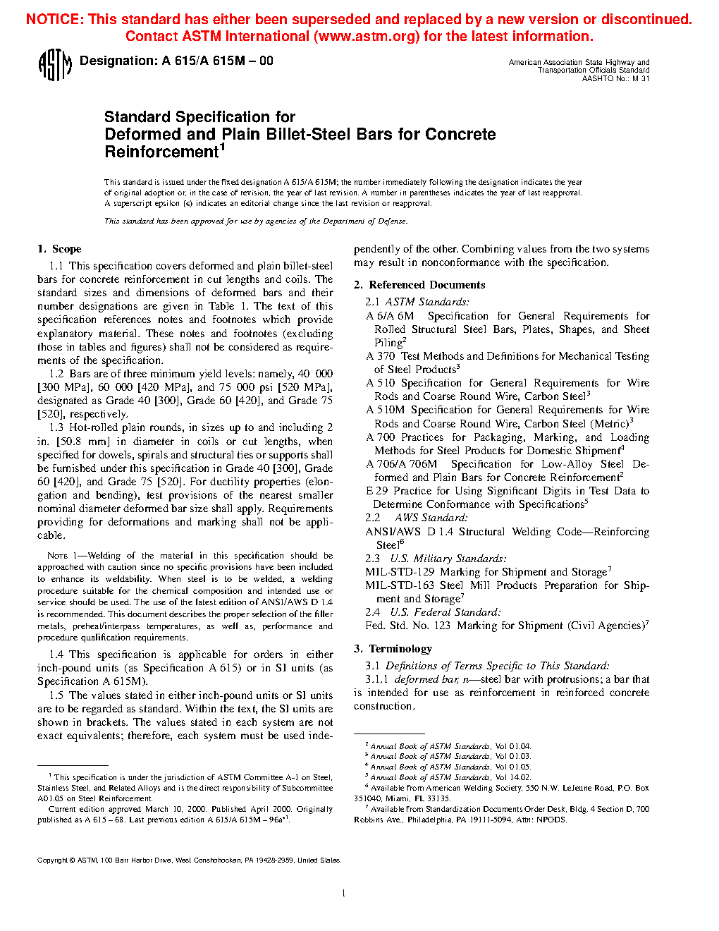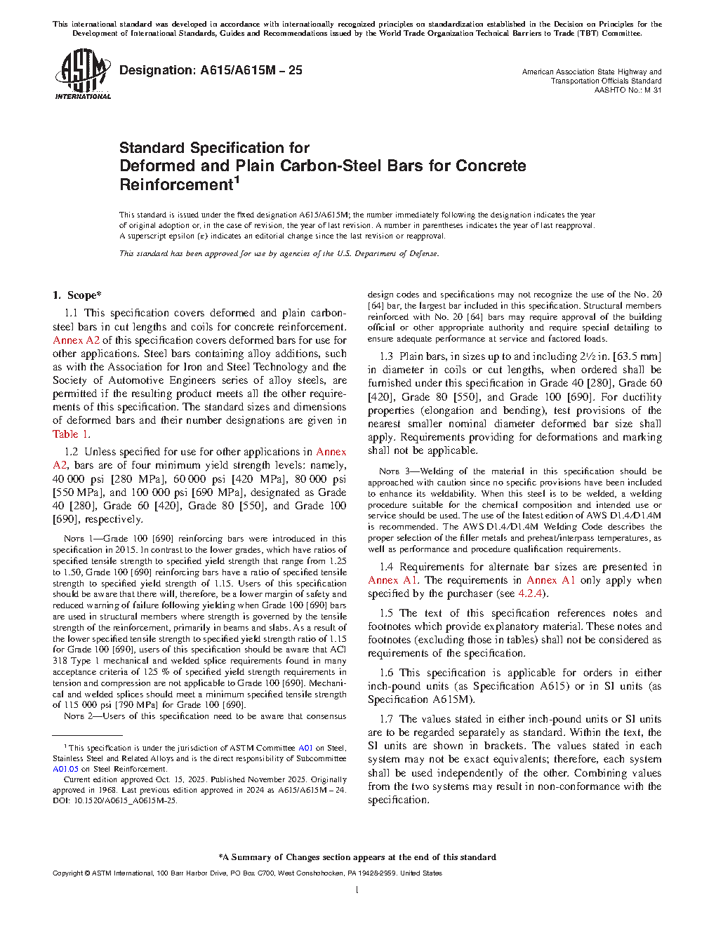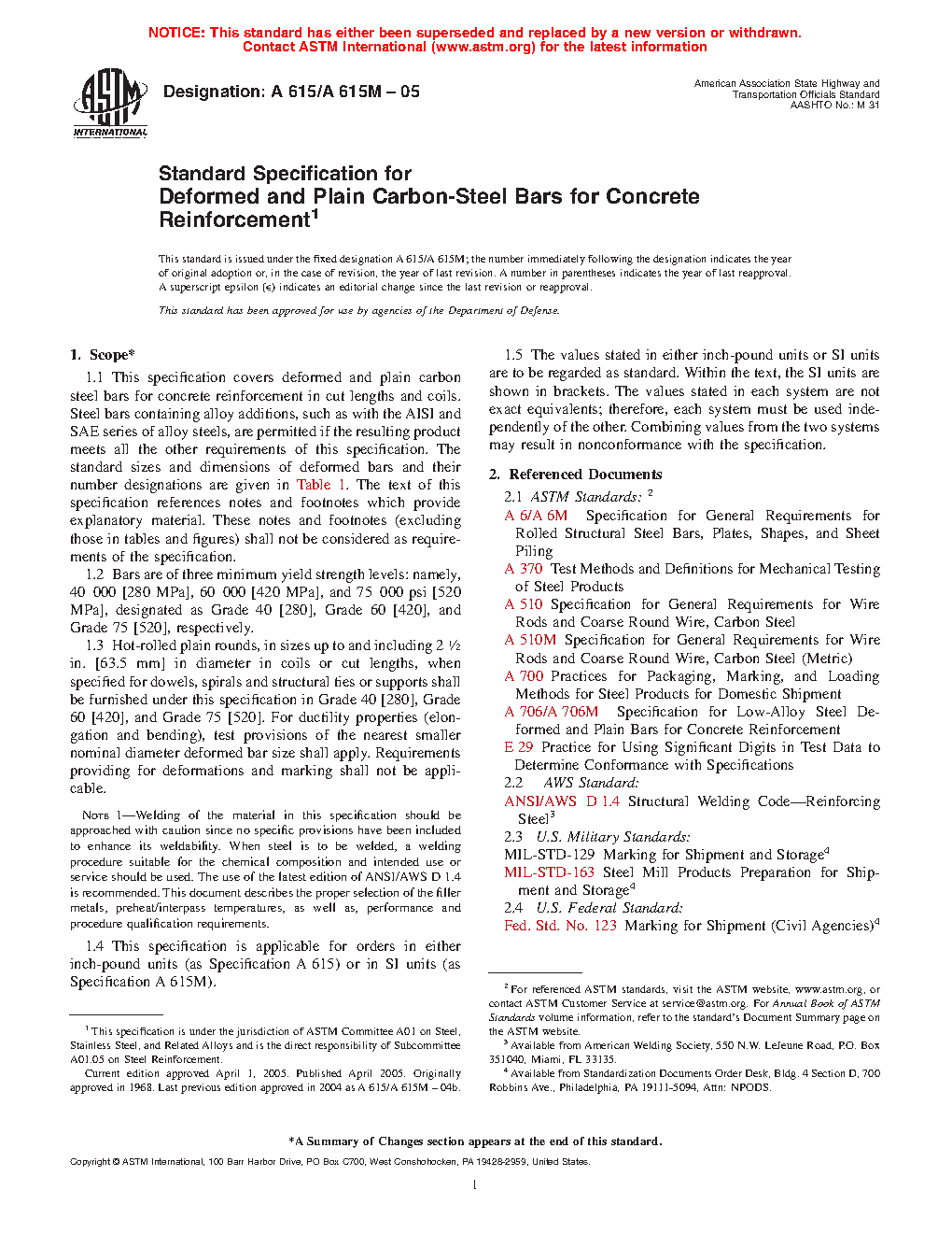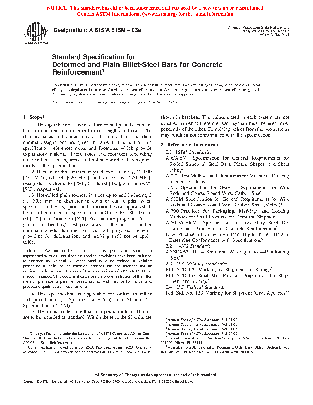 1.1 This specification covers deformed and plain carbon-steel bars in cut lengths and coils for concrete reinforcement. Annex A2 of this specification covers deformed bars for use for other applications. Steel bars containing alloy additions, such as with the Association for Iron and Steel Technology and the Society of Automotive Engineers series of alloy steels, are permitted if the resulting product meets all the other requirements of this specification. The standard sizes and dimensions of deformed bars and their number designations are given in Table 1.