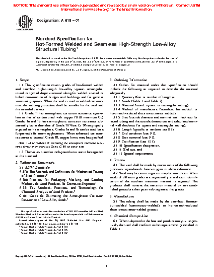1.1 This specification covers grades of hot-formed welded and seamless high-strength low-alloy square, rectangular, round, or special shape structural tubing for welded, riveted, or bolted construction of bridges and buildings and for general structural purposes. When the steel is used in welded construction, the welding procedure shall be suitable for the steel and the intended service.