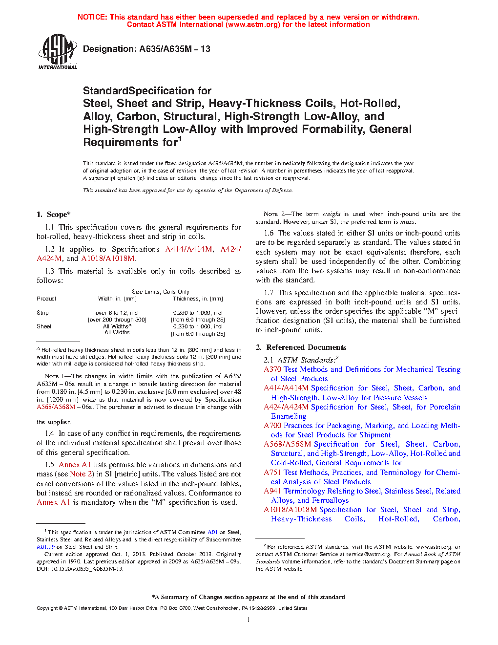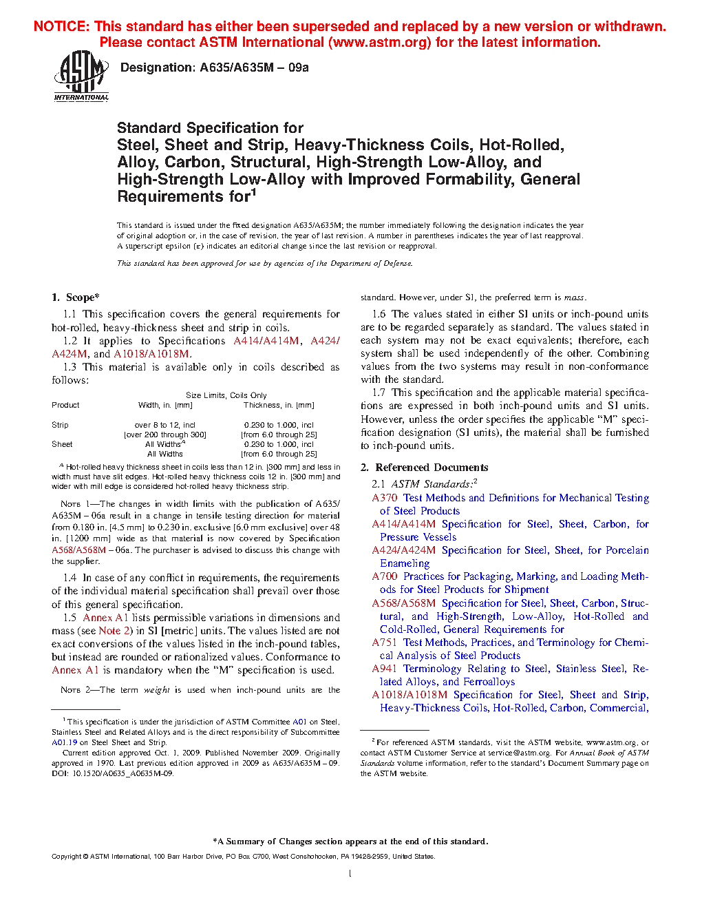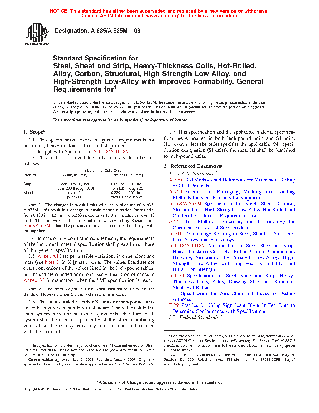 Note 1: The changes in width limits with the publication of A635/A635M – 06a result in a change in tensile testing direction for material from 0.180 in. [4.5 mm] to 0.230 in. exclusive [6.0 mm exclusive] over 48 in. [1200 mm] wide, as that material is now covered by Specification A568/A568M – 06a. The purchaser is advised to discuss this change with the supplier.