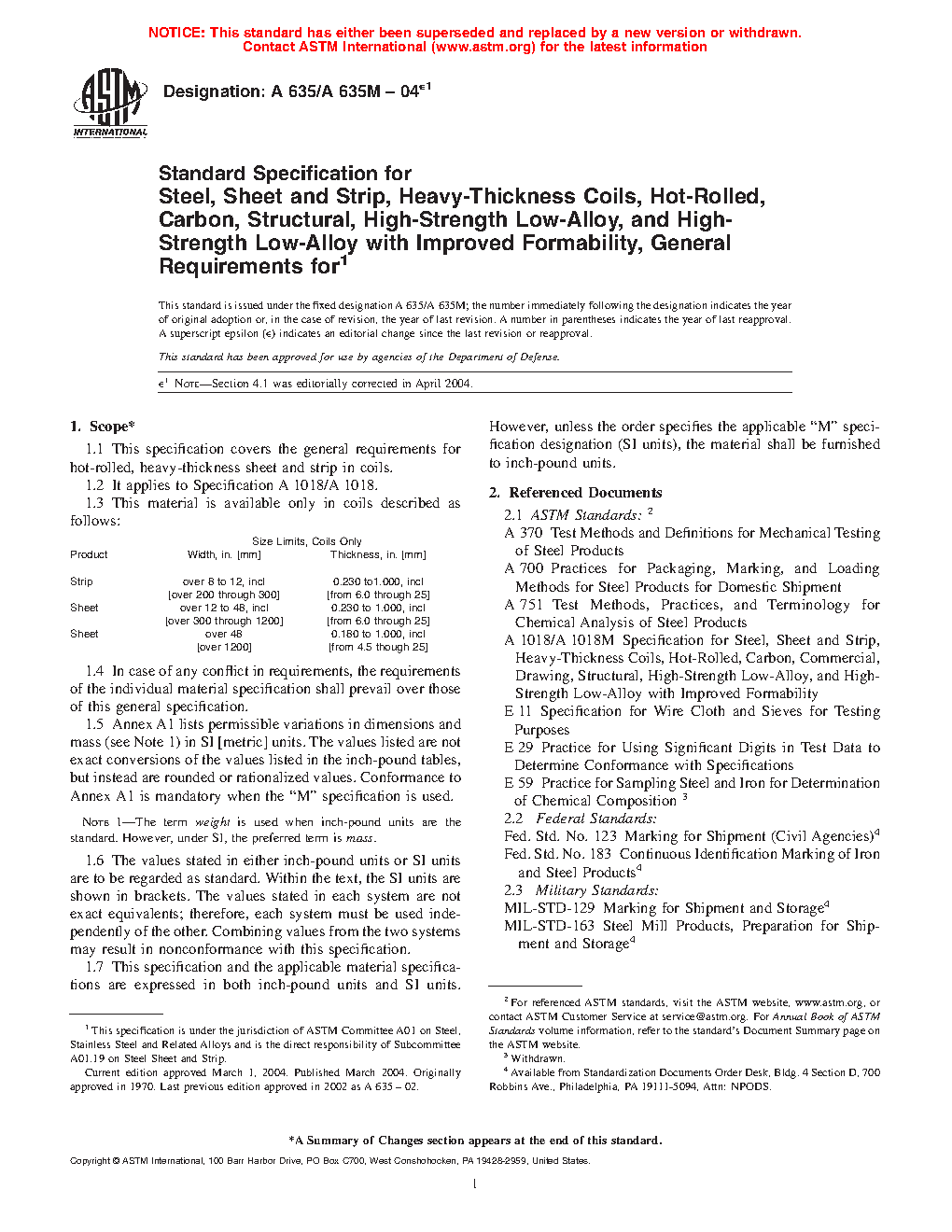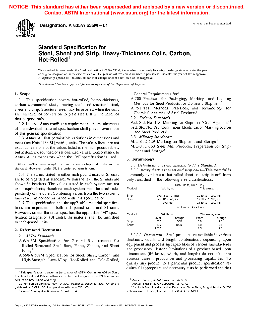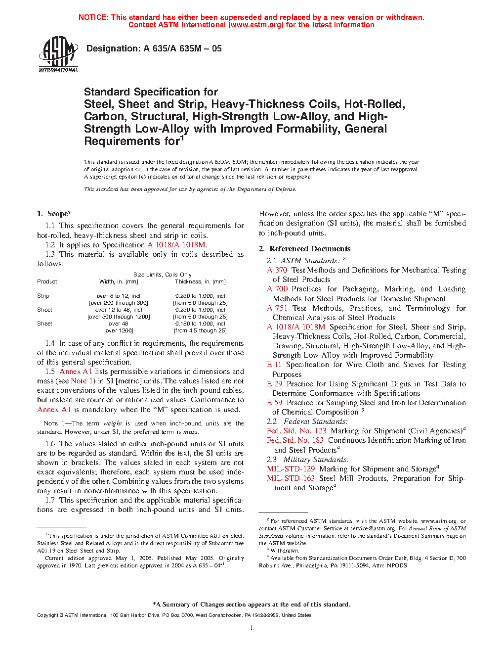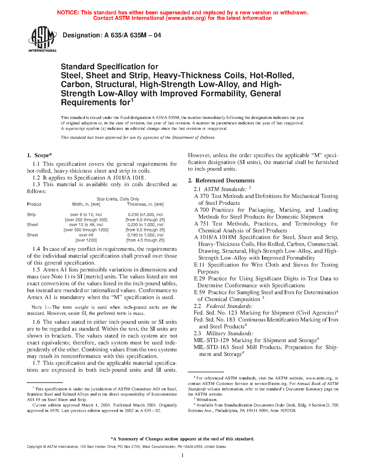 Note 1: The changes in width limits with the publication of A635/A635M – 06a result in a change in tensile testing direction for material from 0.180 in. [4.5 mm] to 0.230 in. exclusive [6.0 mm exclusive] over 48 in. [1200 mm] wide, as that material is now covered by Specification A568/A568M – 06a. The purchaser is advised to discuss this change with the supplier.