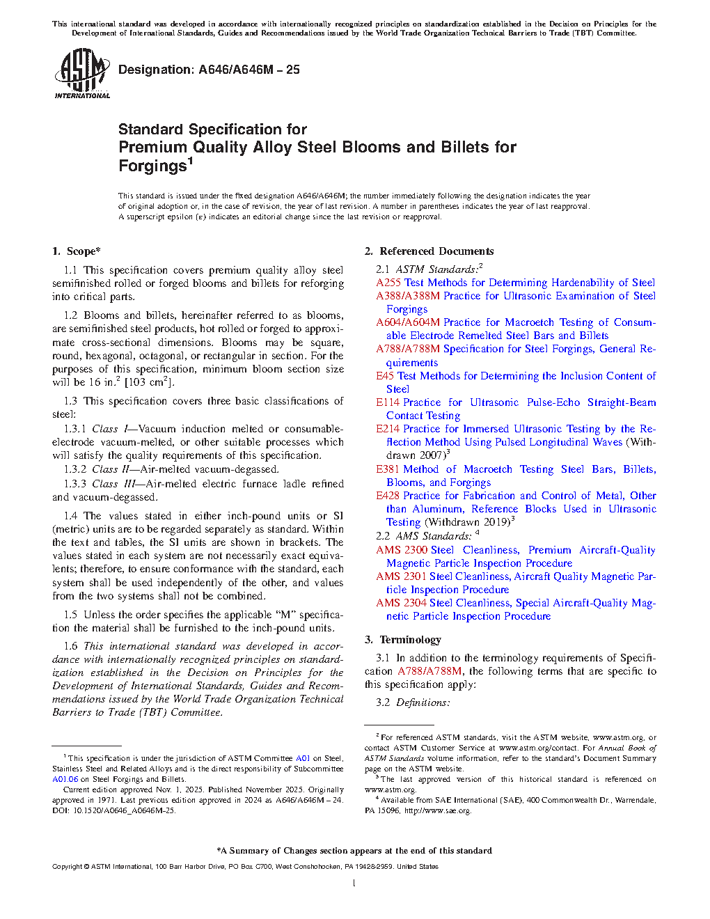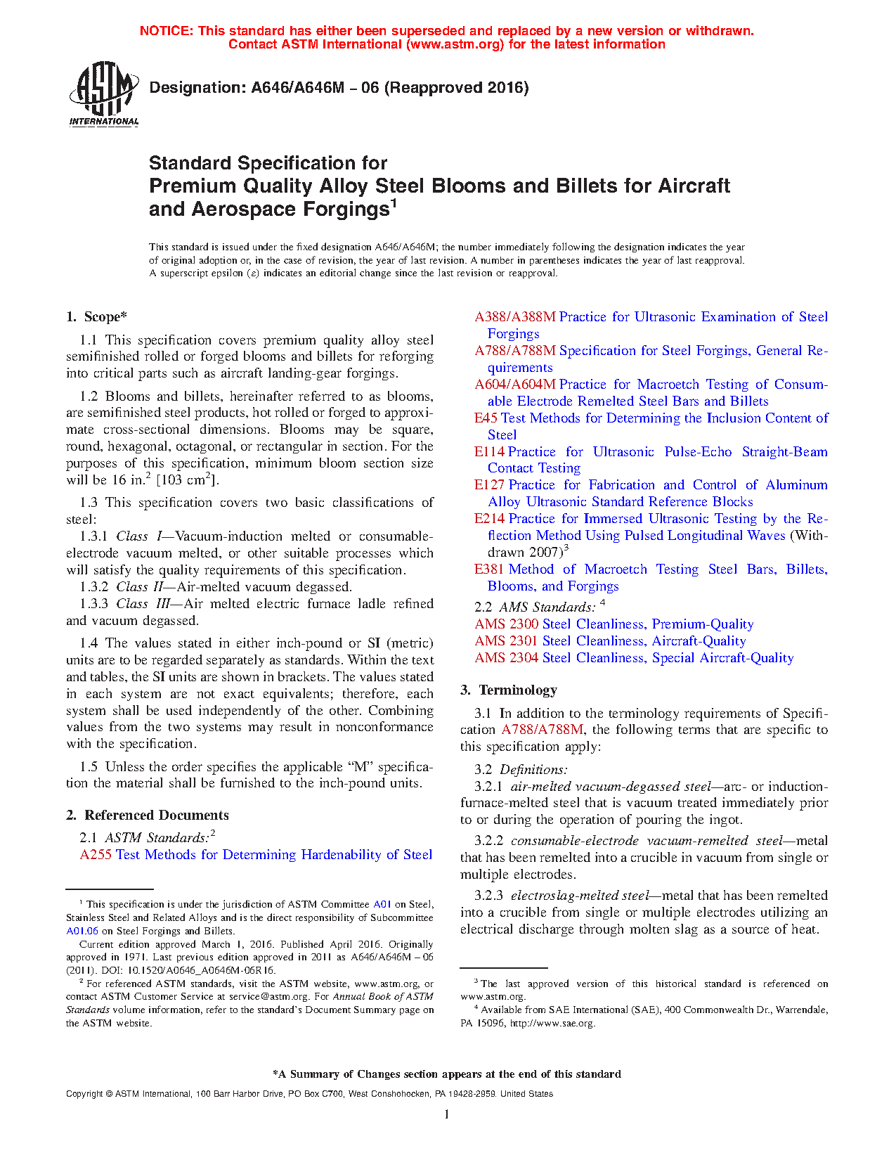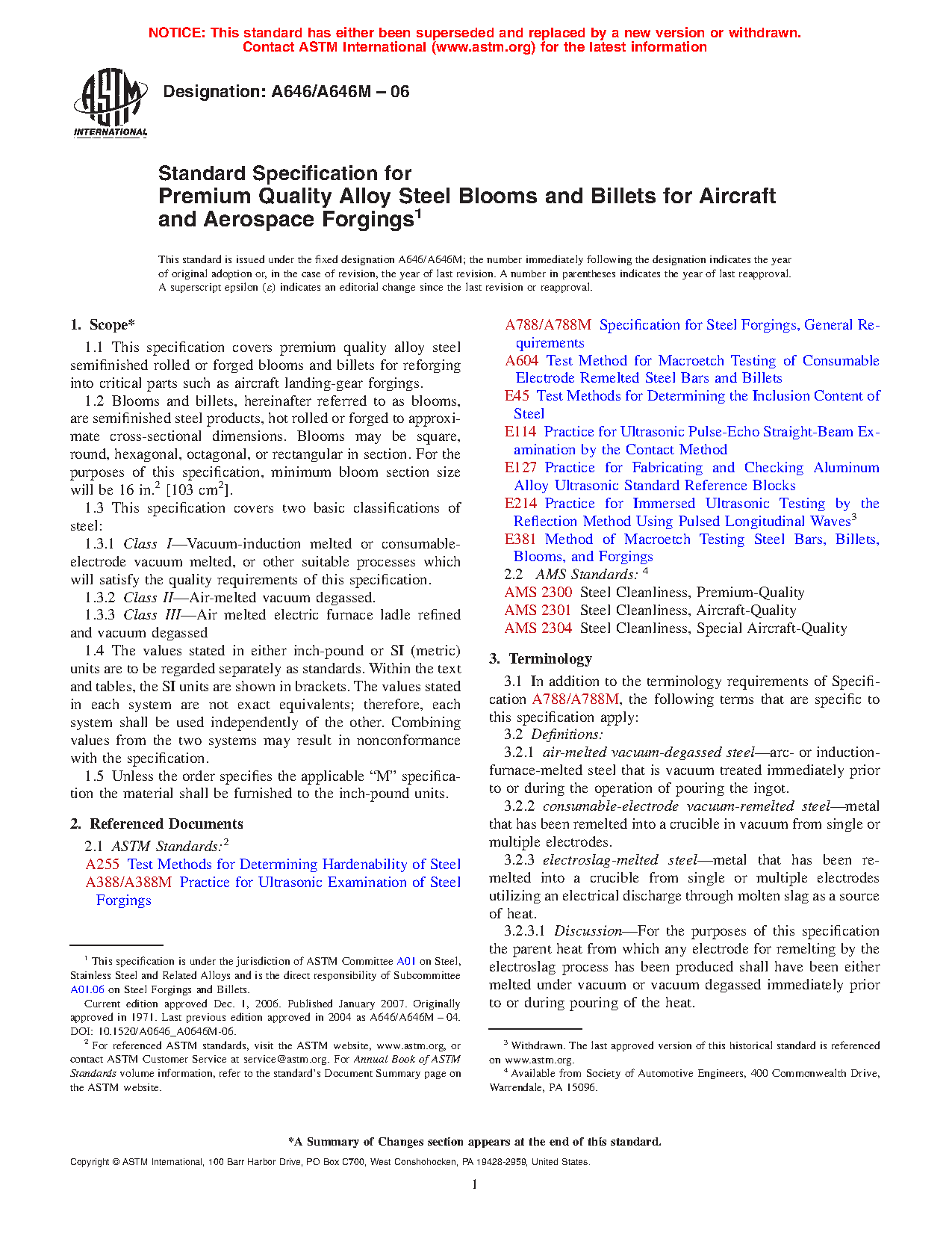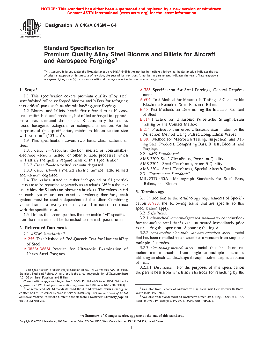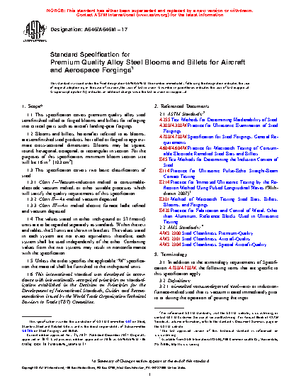 This specification deals with the standard requirements for premium quality alloy steel semifinished rolled or forged blooms and billets for reforging into aircraft and aerospace critical parts such as landing-gear forgings. Covered here are three basic classifications of steel, namely: Class I, steel manufactured by vacuum-induction melting or consumable-electrode vacuum melting process; Class II, air-melted steel manufactured by electric-furnace vacuum degassing process; Class III, air-melted steel manufactured by electric-furnace ladle refining and vacuum degassing processes. Steel materials shall be heat-treated and hot-worked by either hot rolling or forging. Alloy steels shall be examined by heat and product analyses and hardenability tests, and shall conform to chemical composition and maximum annealed Brinell hardness requirements. Quality evaluation tests, such as macrotech, microcleanliness, and nondestructive ultrasonic (both immersion and contact examination) inspection, shall be performed as well.