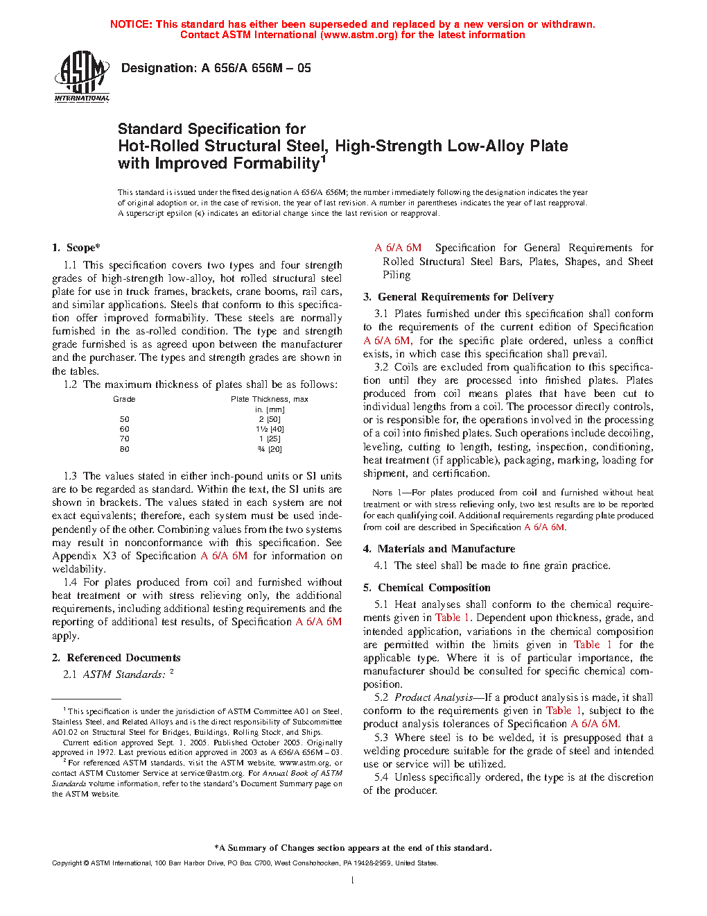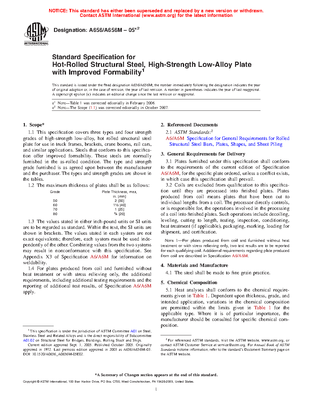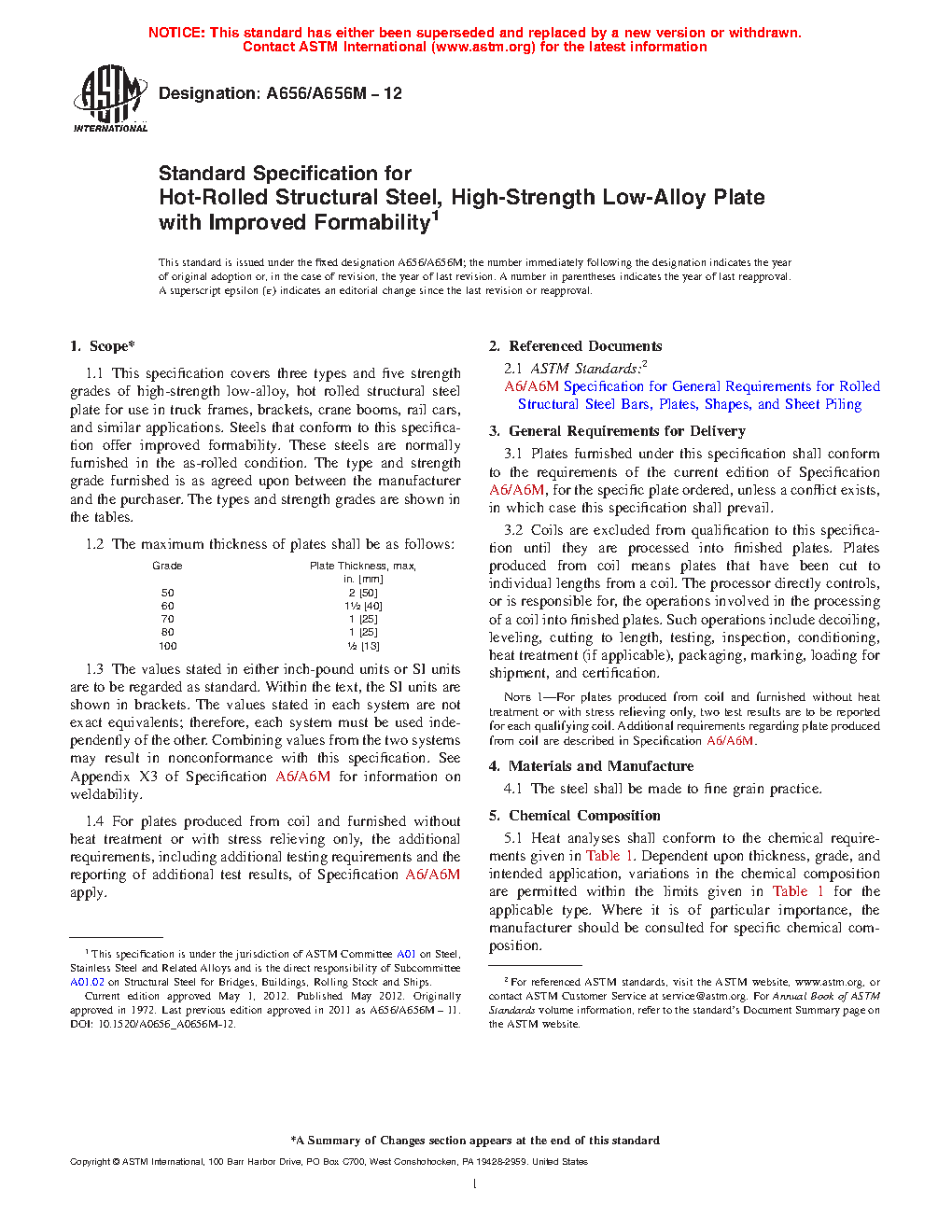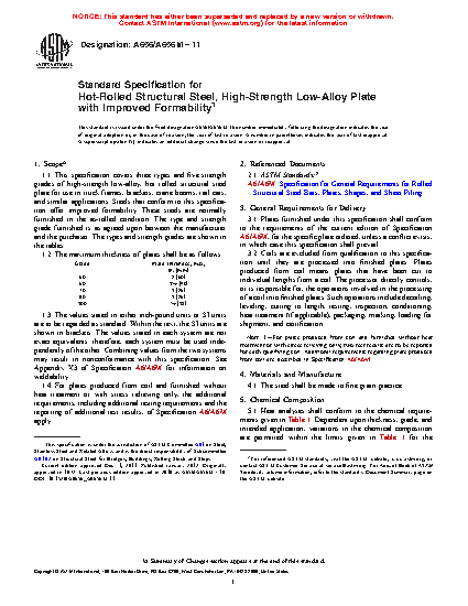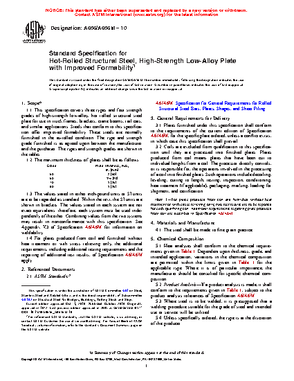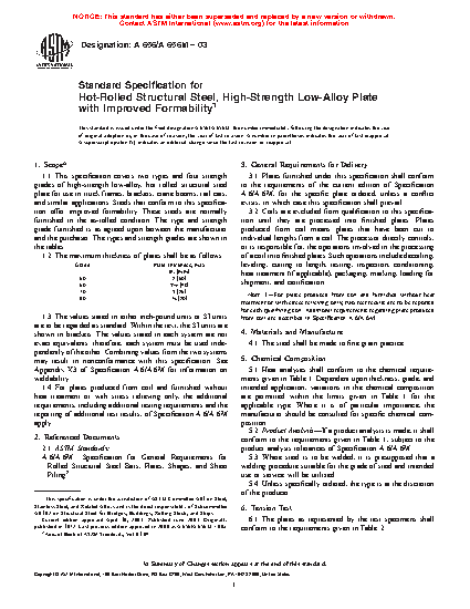 1.1 This specification covers three types and five strength grades of high-strength low-alloy, hot rolled structural steel plate for use in truck frames, brackets, crane booms, rail cars, and similar applications. Steels that conform to this specification offer improved formability. These steels are normally furnished in the as-rolled condition. The type and strength grade furnished is as agreed upon between the manufacturer and the purchaser. The types and strength grades are shown in the tables.