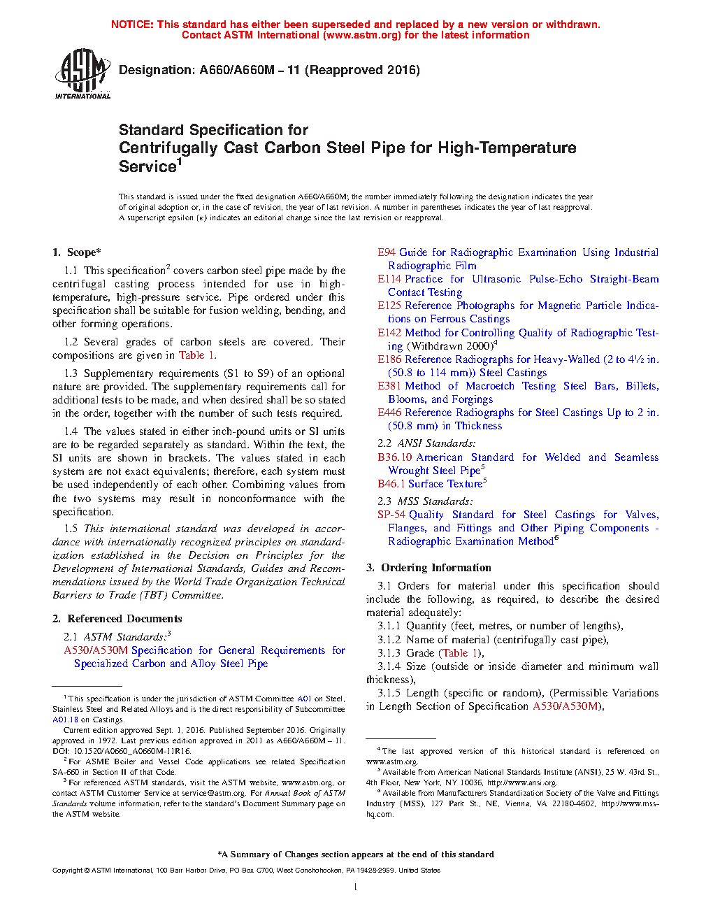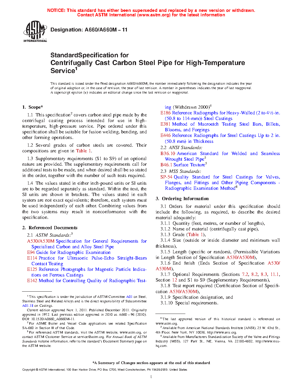 1.1 This specification2 covers carbon steel pipe made by the centrifugal casting process intended for use in high-temperature, high-pressure service. Pipe ordered under this specification shall be suitable for fusion welding, bending, and other forming operations.