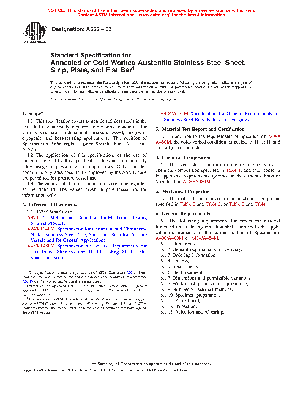 1.1 This specification covers austenitic stainless steels in the annealed and normally required cold-worked conditions for various structural, pressure vessel, magnetic, cryogenic, and heat-resisting applications. (This revision of Specification A666 replaces prior Specifications A412 and A177.)
