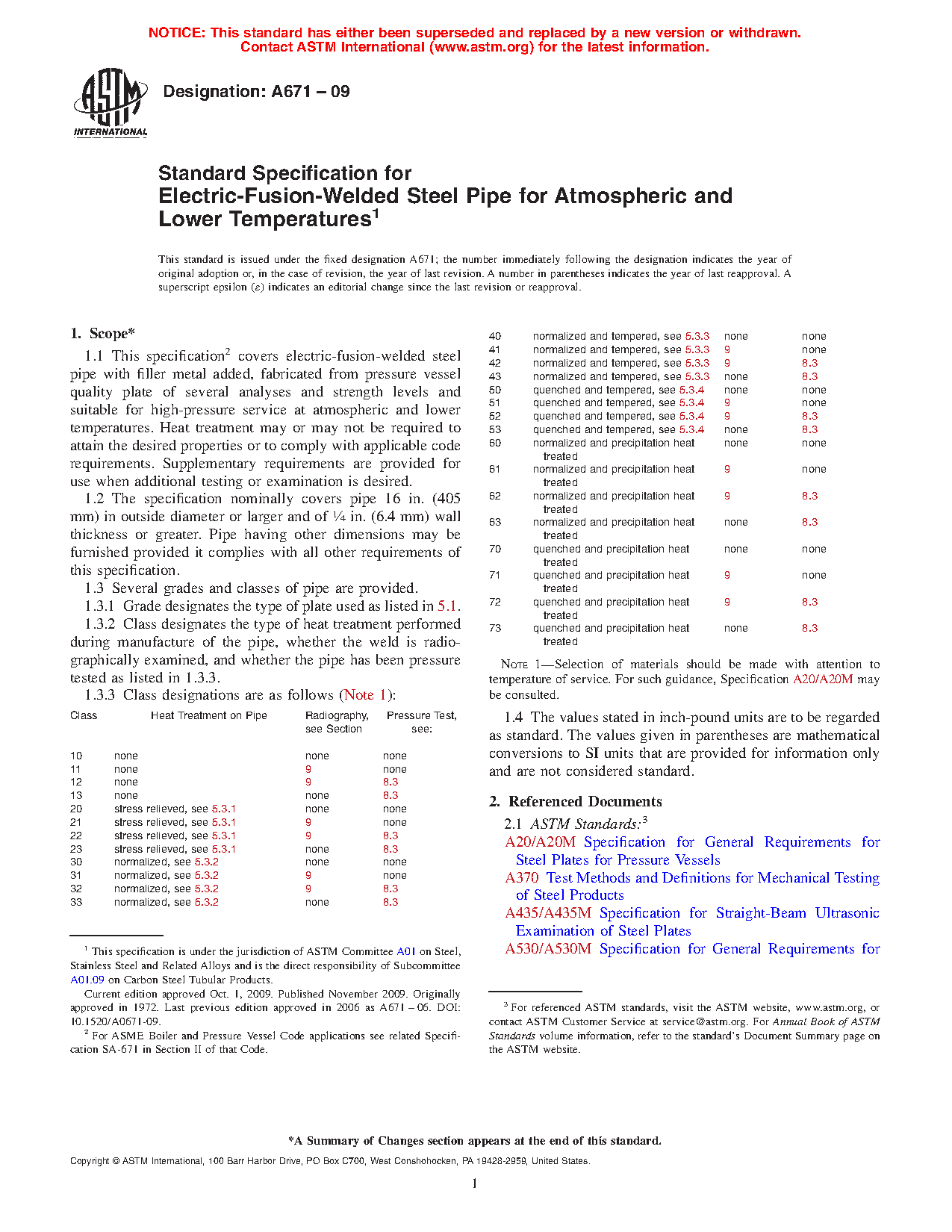 This specification covers standard requirements for electric-fusion-welded steel pipe with filler metal added, for atmospheric and lower temperatures. The steel pipe shall be fabricated from a pressure vessel quality plate of various analysis and strength levels. Several grades and classes of pipe shall be provided. Grade shall designate the type of plate used while class shall designate the type of heat treatment performed during pipe manufacture. Class shall be designated as to whether the weld is radiographically examined, and as to whether the pipe is pressure tested. Steel samples shall undergo tension and transverse guided weld bend tests and conform to the specified mechanical requirements..