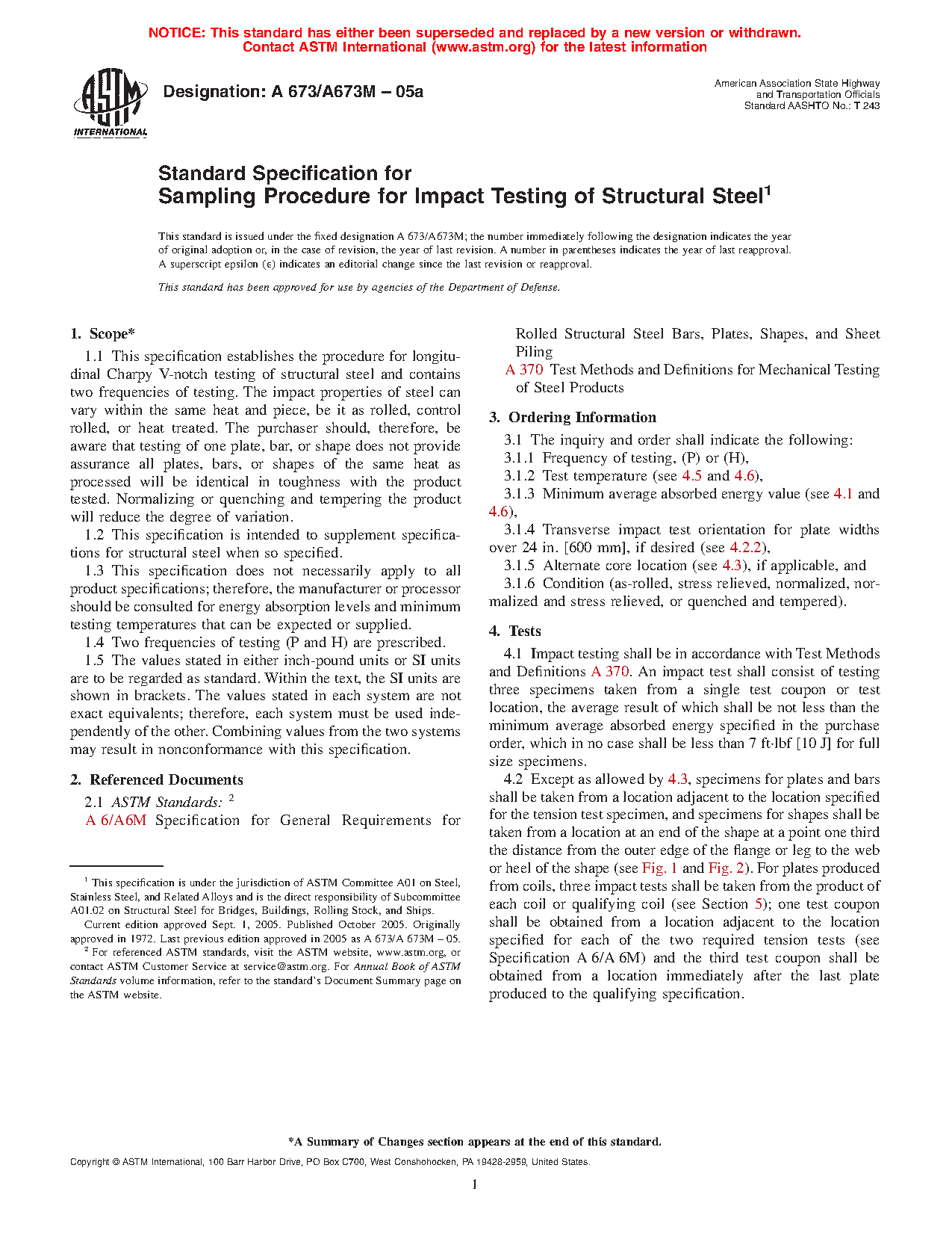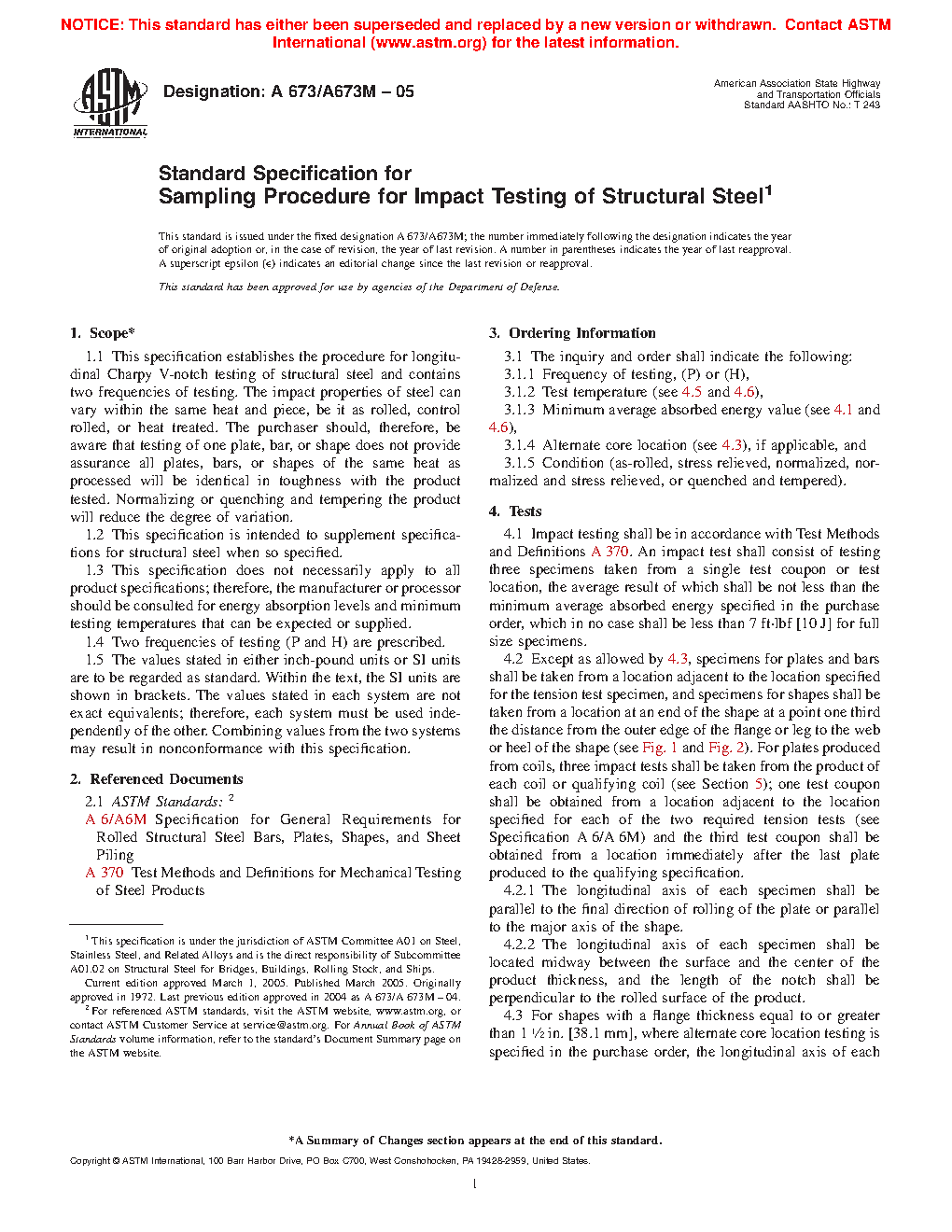 1.1 This specification establishes the procedure for longitudinal Charpy V-notch testing of structural steel and contains two frequencies of testing. The impact properties of steel can vary within the same heat and piece, be it as rolled, control rolled, or heat treated. The purchaser should, therefore, be aware that testing of one plate, bar, or shape does not provide assurance all plates, bars, or shapes of the same heat as processed will be identical in toughness with the product tested. Normalizing or quenching and tempering the product will reduce the degree of variation.