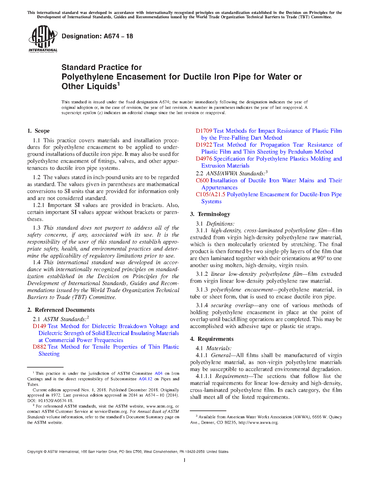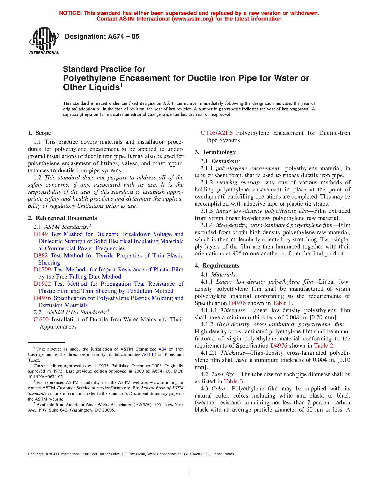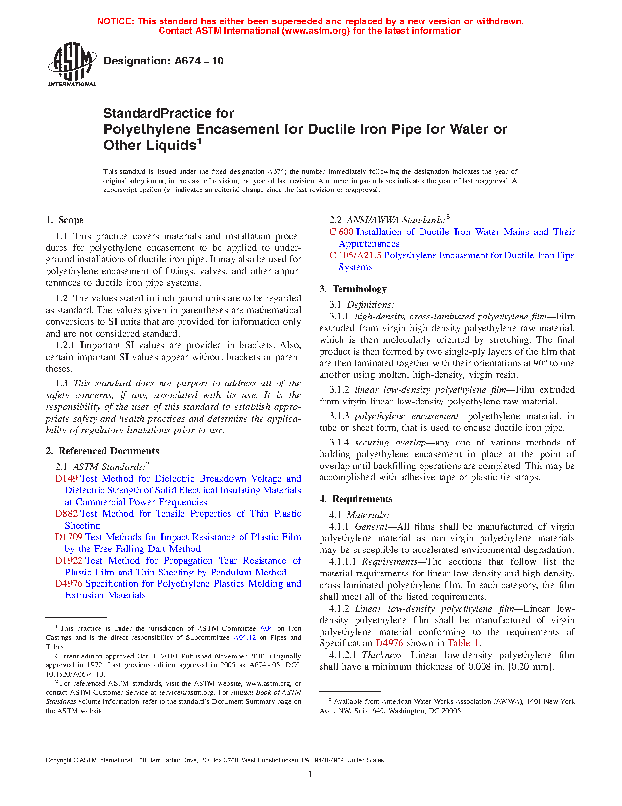 Standard Practice for Polyethylene Encasement for Ductile Iron Pipe for Water or Other Liquids