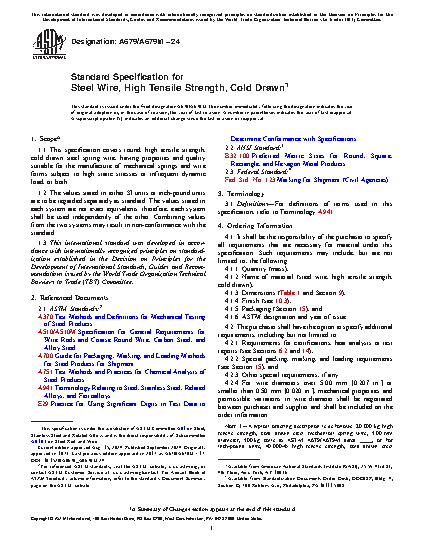 1.1 This specification covers round, high tensile strength, cold drawn steel spring wire, having properties and quality suitable for the manufacture of mechanical springs and wire forms subject to high static stresses or infrequent dynamic load, or both.