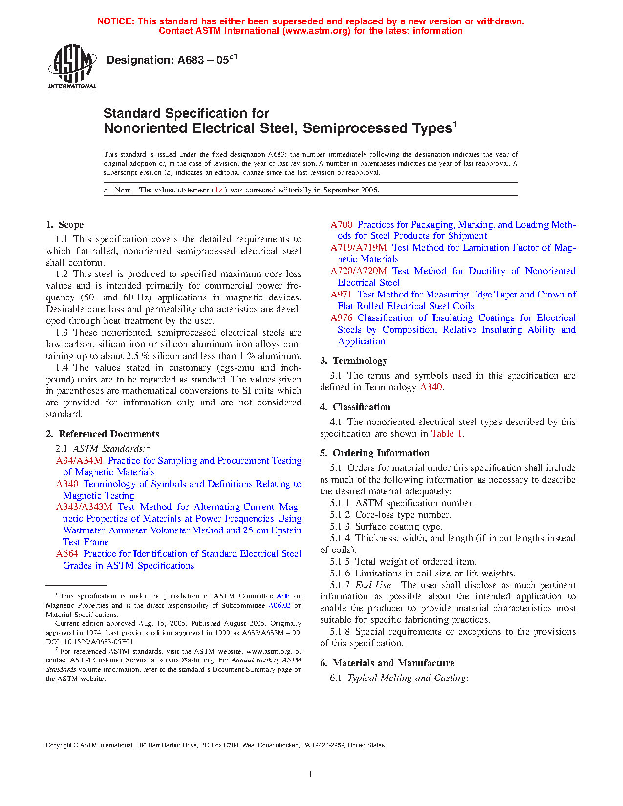 1.1 This specification covers the detailed requirements to which flat-rolled, nonoriented semiprocessed electrical steel shall conform.