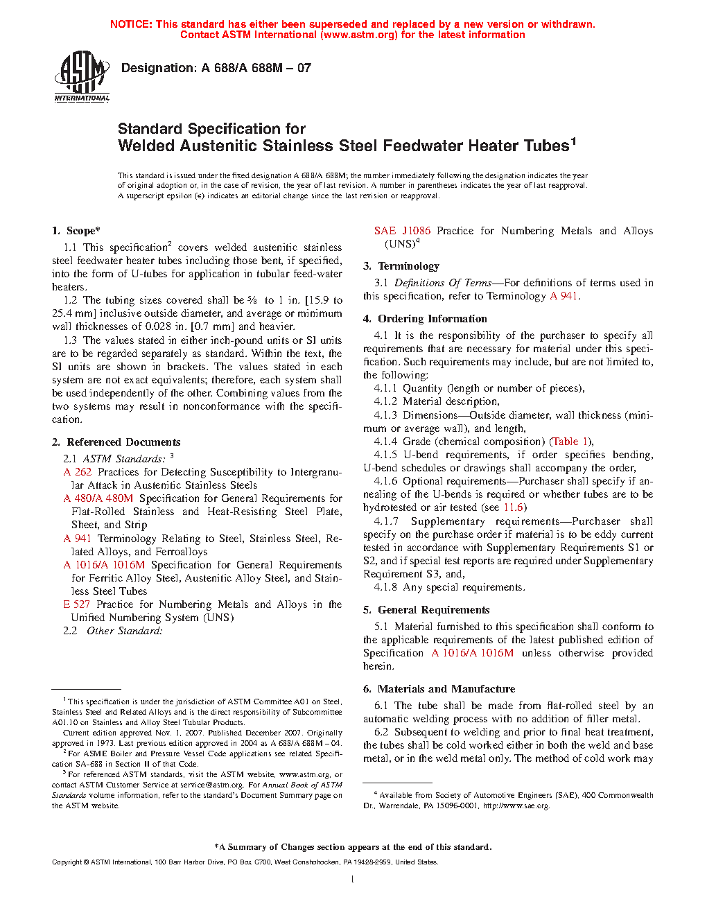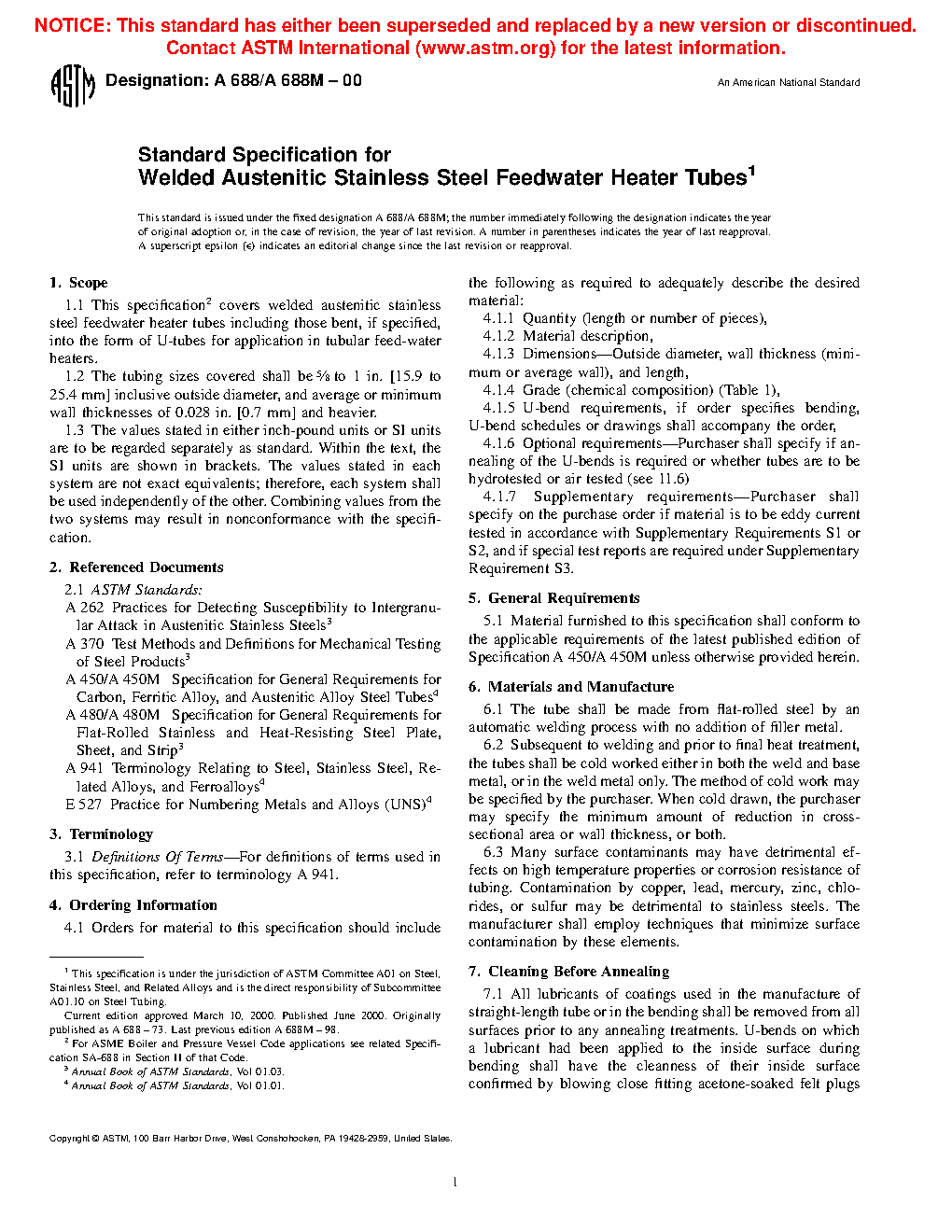 1.1 This specification2 covers seamless and welded austenitic stainless steel feedwater heater tubes including those bent, if specified, into the form of U-tubes for application in tubular feed-water heaters.