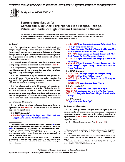 1.1 This specification covers forged or rolled steel pipe flanges, forged fittings, valves, and parts suitable for use with high-strength transmission-service pipe. Included are flanges, fittings, and similar parts ordered either to dimensions specified by the purchaser or to ASME or MSS dimensional standards referenced in Section 2.