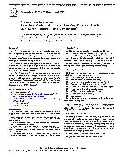 1.1 This specification2 covers hot-wrought and cold-finished special quality carbon steel bars, in straight lengths only, subject to mechanical property requirements and intended for use in manufacturing components for pressure piping and other pressure-containing applications.