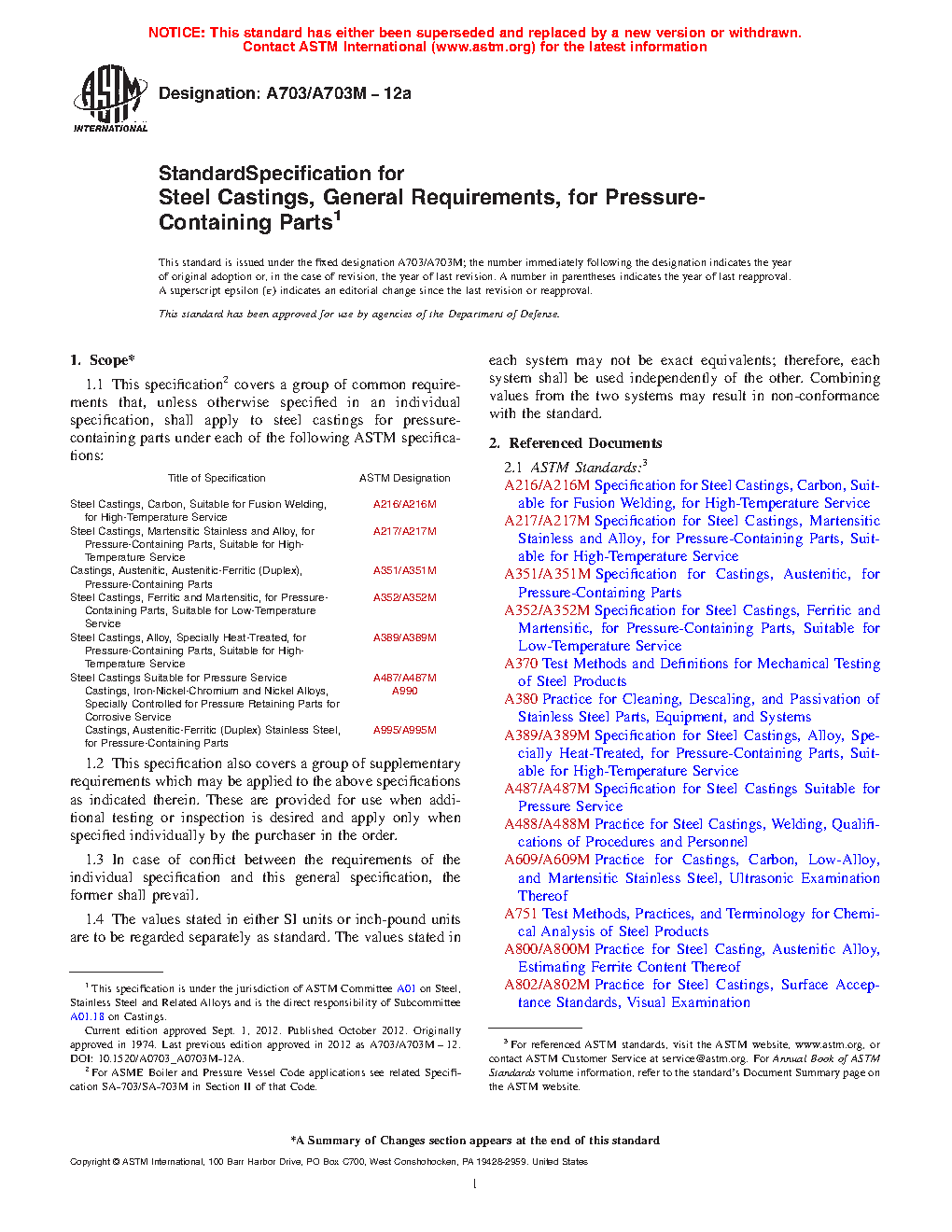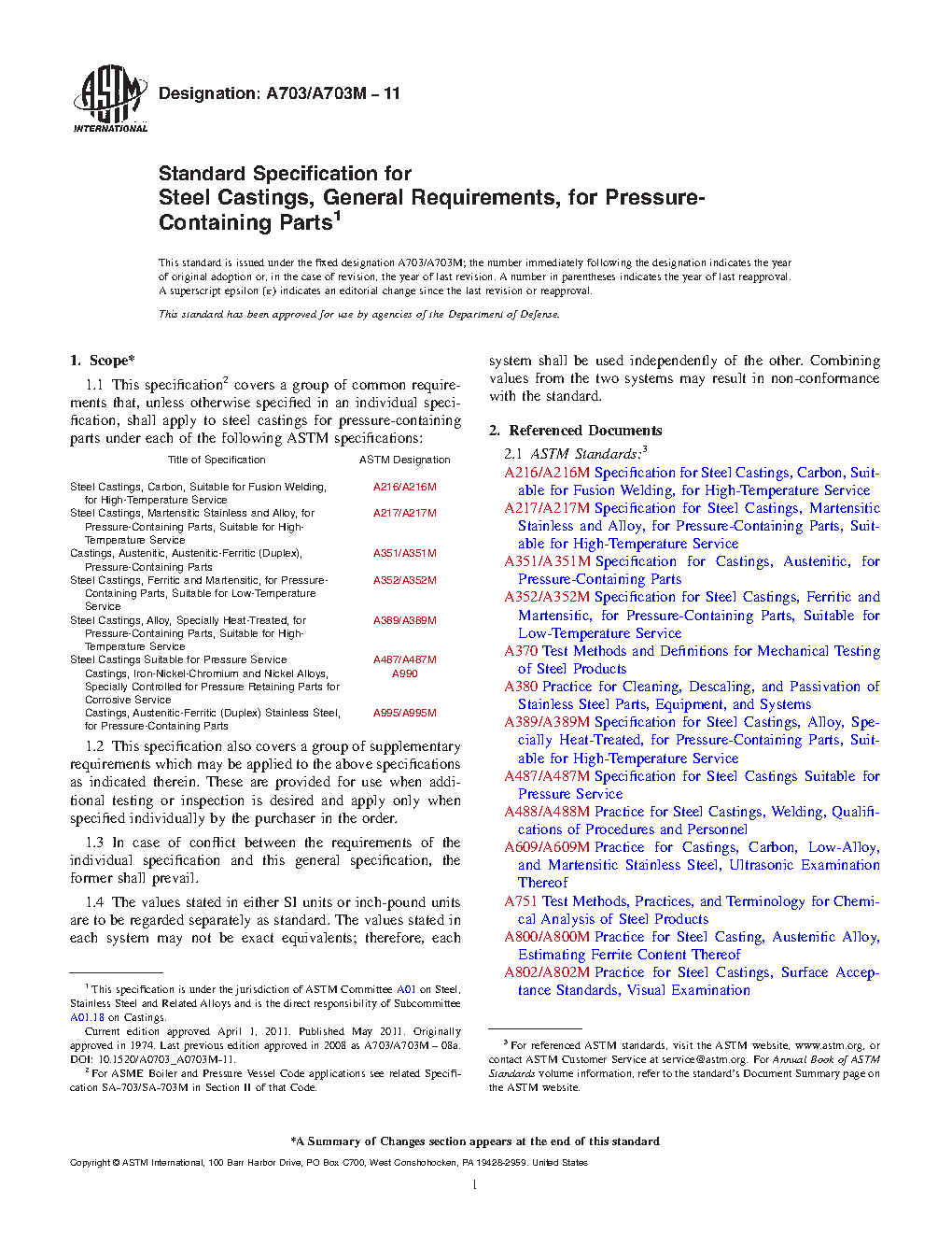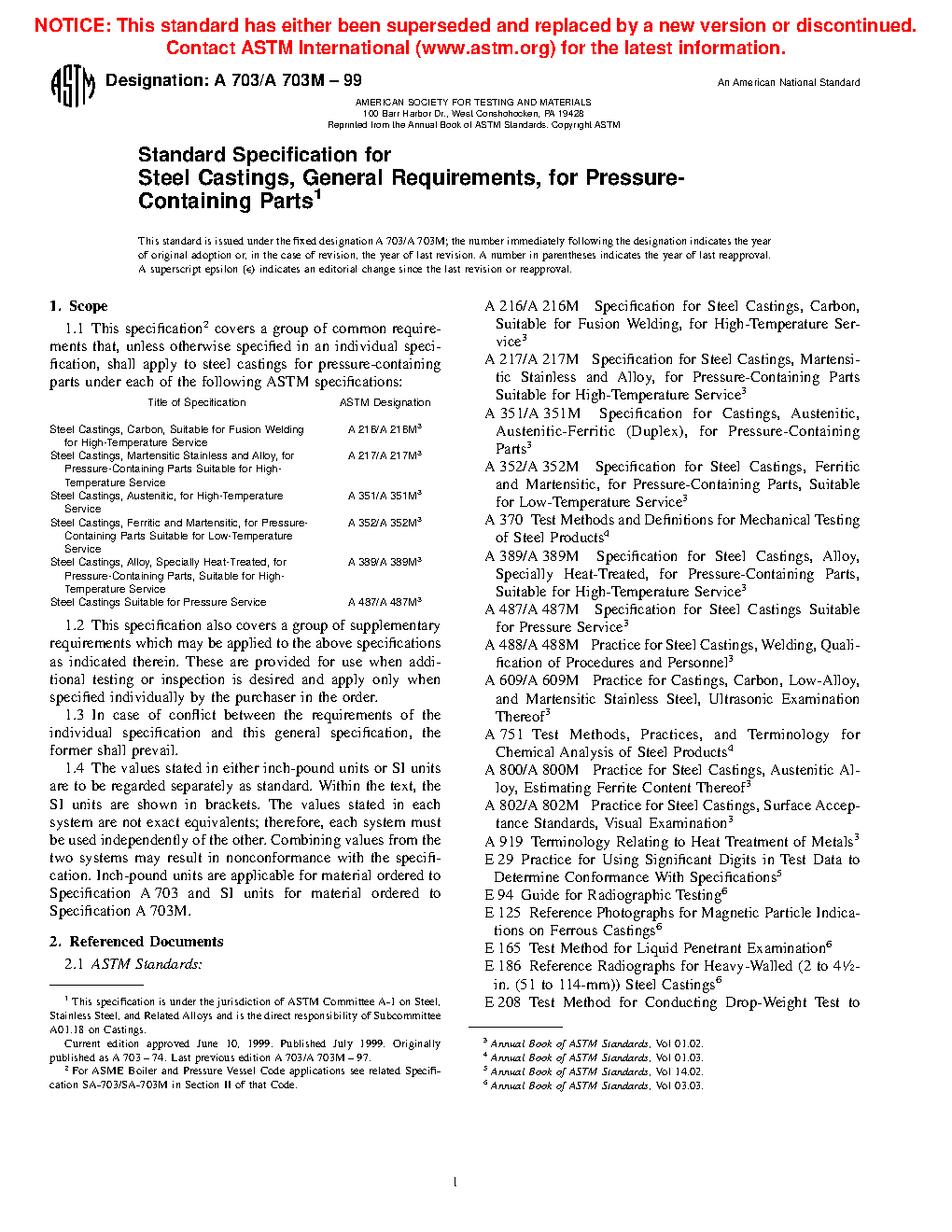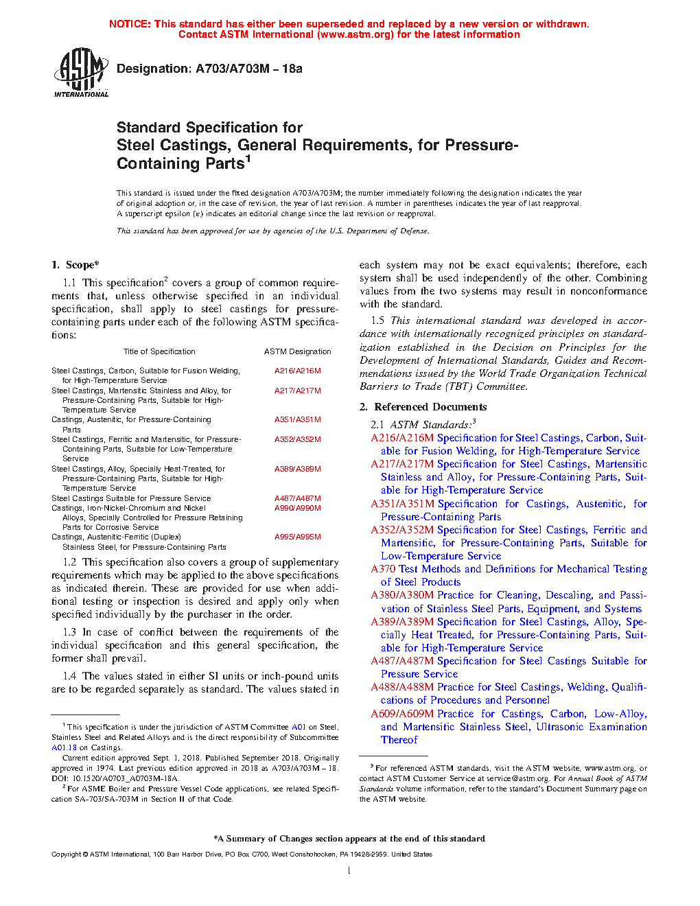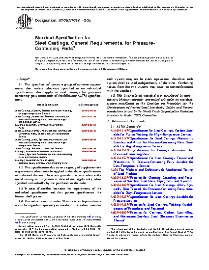 1.1 This specification2 covers a group of common requirements that, unless otherwise specified in an individual specification, shall apply to steel castings for pressure-containing parts under each of the following ASTM specifications: