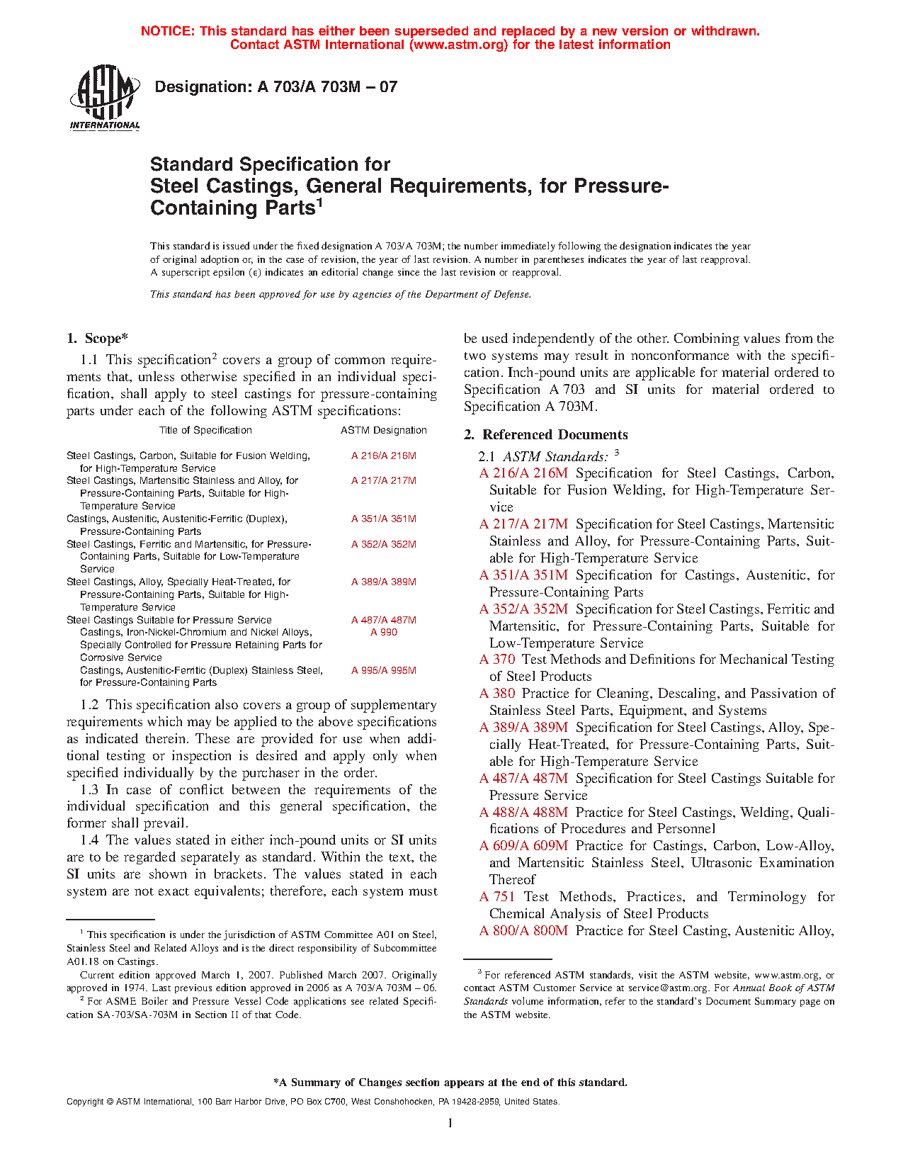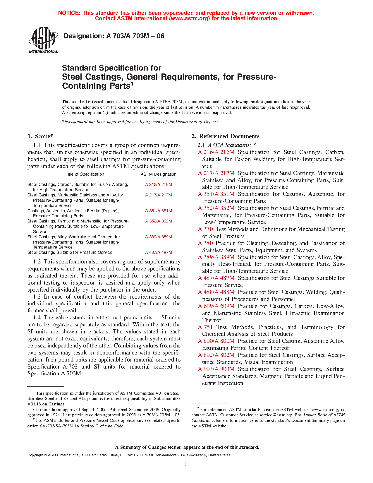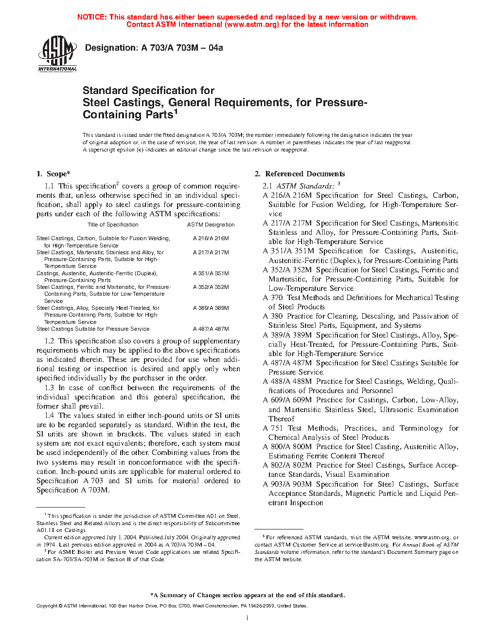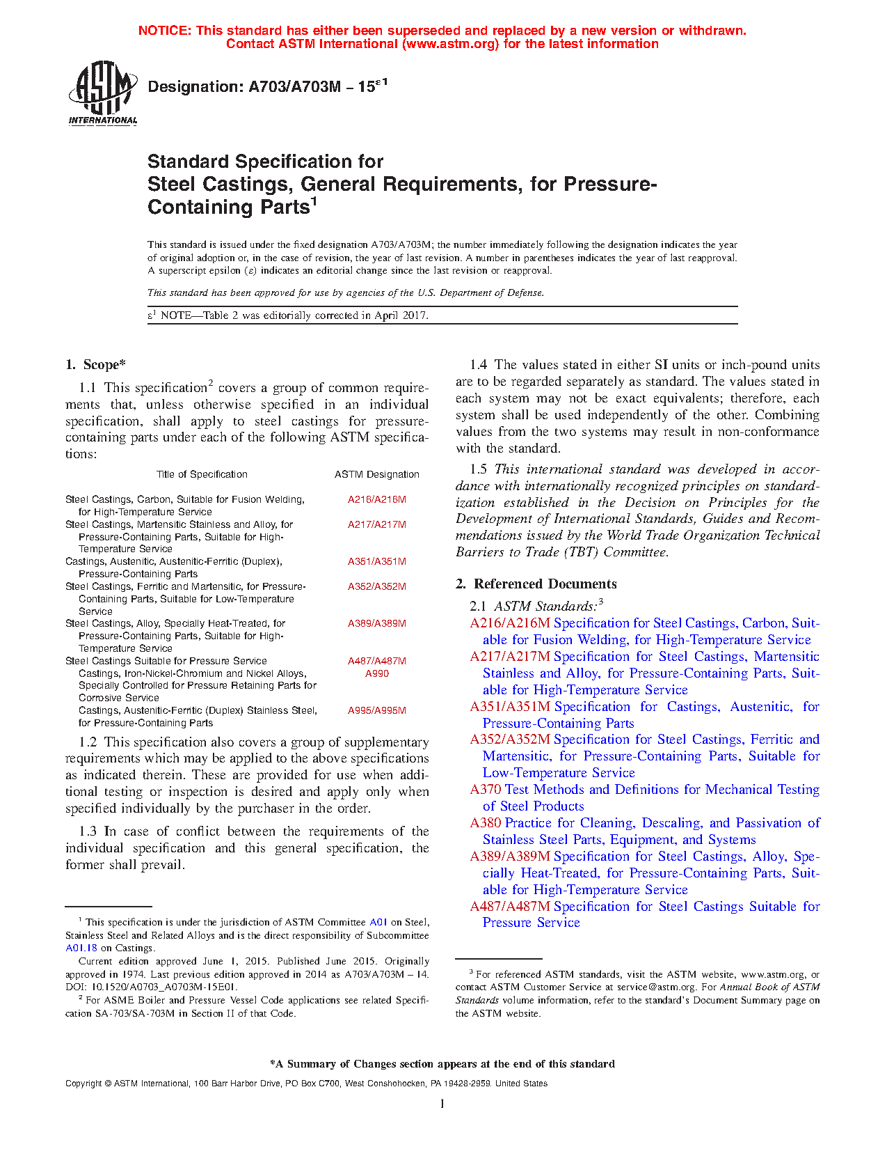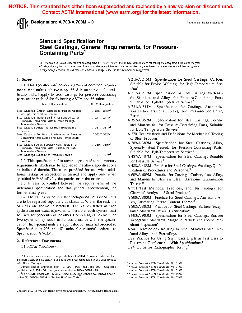 1.1 This specification2 covers a group of common requirements that, unless otherwise specified in an individual specification, shall apply to steel castings for pressure-containing parts under each of the following ASTM specifications: