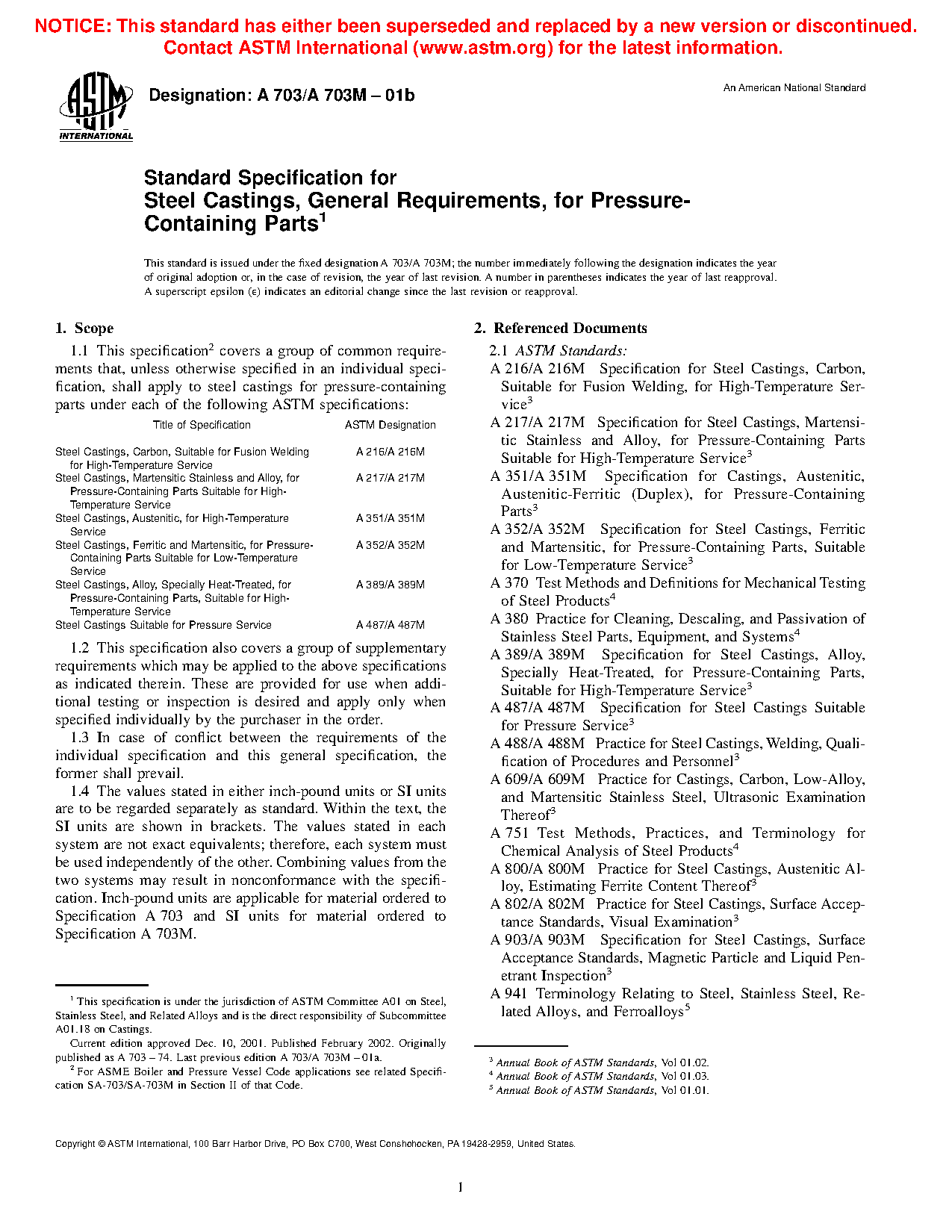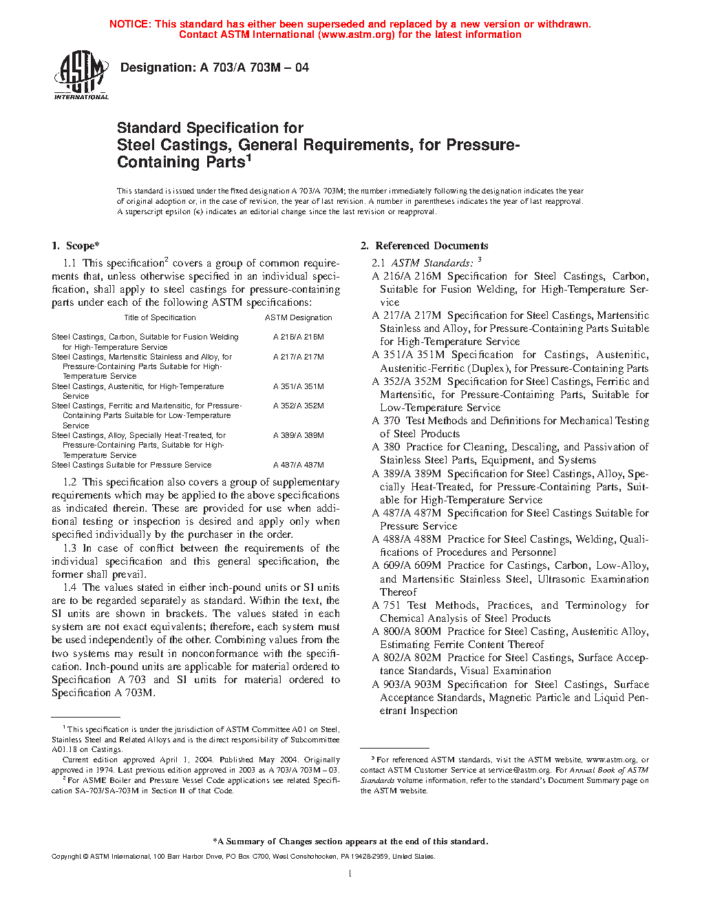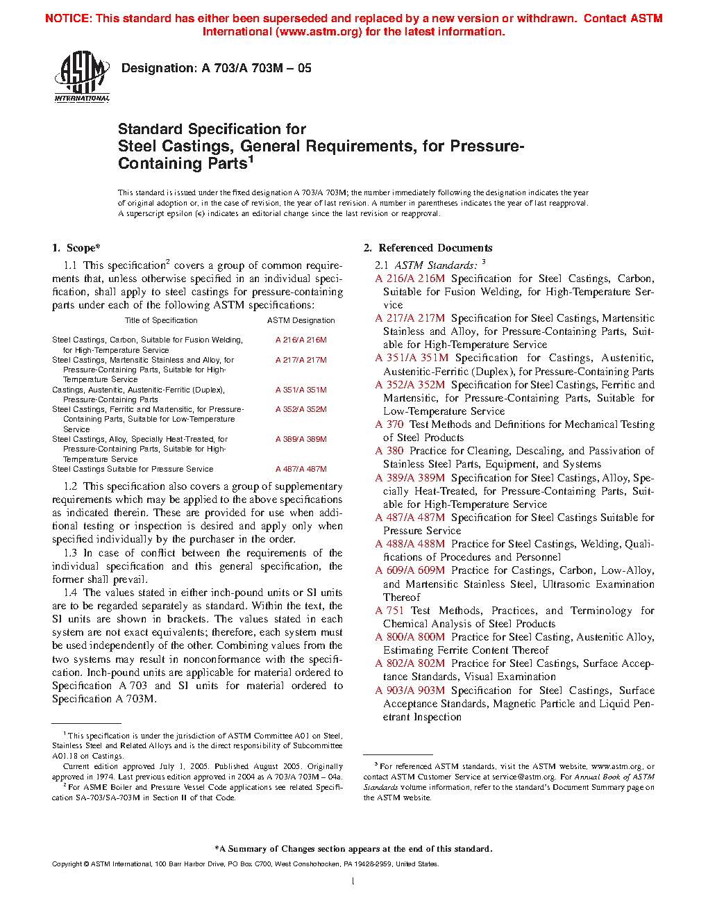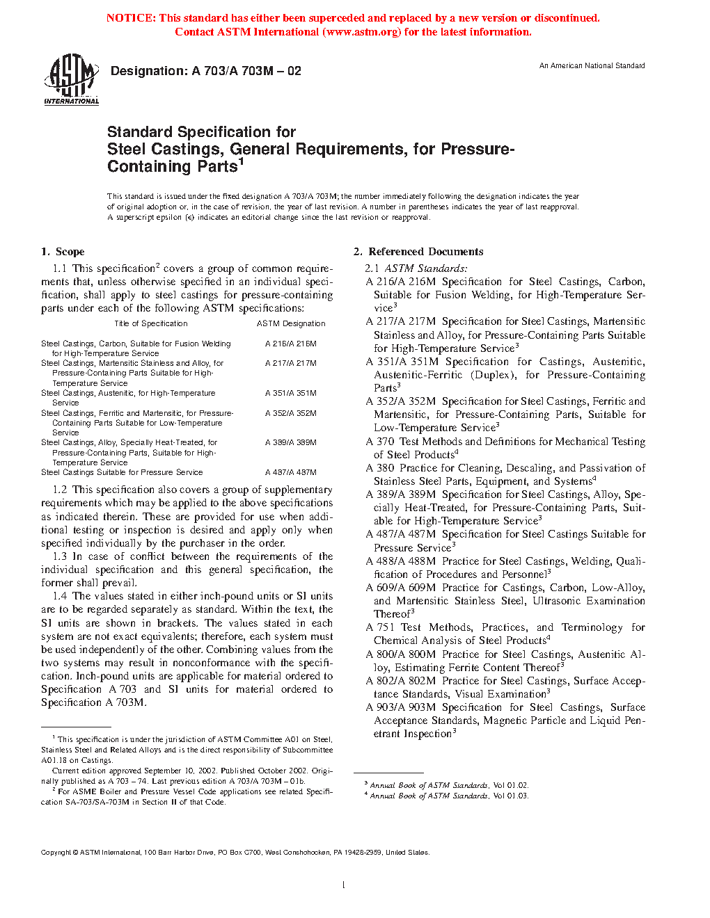 1.1 This specification2 covers a group of common requirements that, unless otherwise specified in an individual specification, shall apply to steel castings for pressure-containing parts under each of the following ASTM specifications: