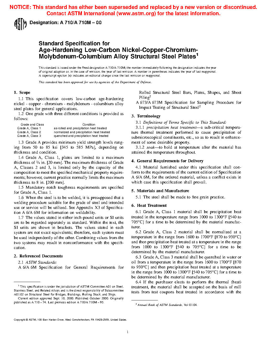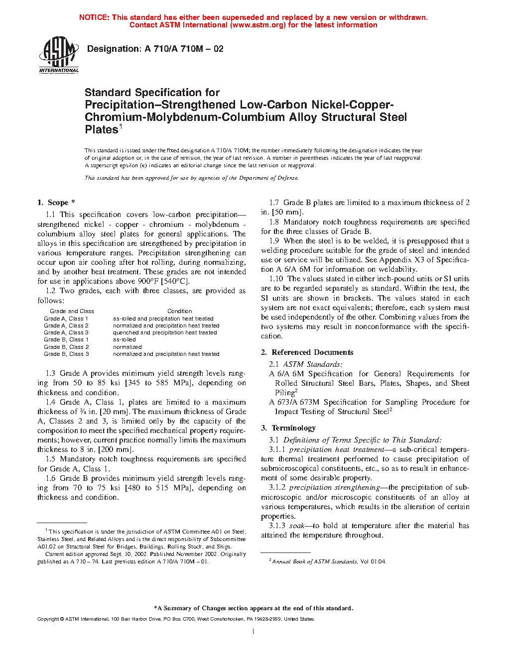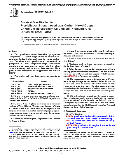 1.1 This specification covers low-carbon precipitation — strengthened nickel - copper - chromium - molybdenum - columbium (niobium) alloy steel plates for general applications. The alloys in this specification are strengthened by precipitation in various temperature ranges. Precipitation strengthening can occur upon air cooling after hot rolling, during normalizing, and by another heat treatment. These grades are not intended for use in applications above 900°F [480°C].
