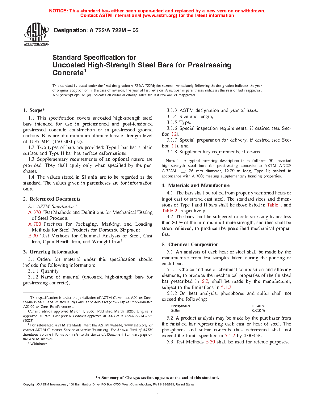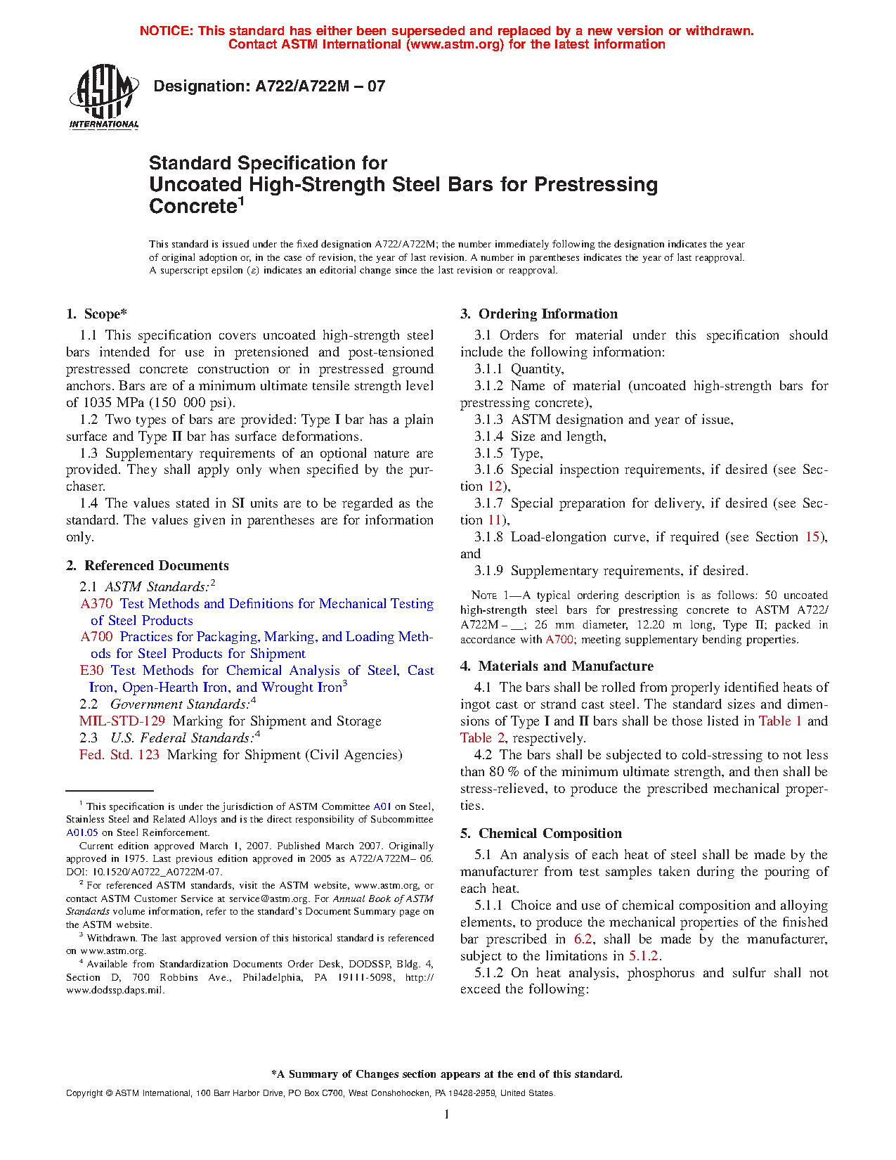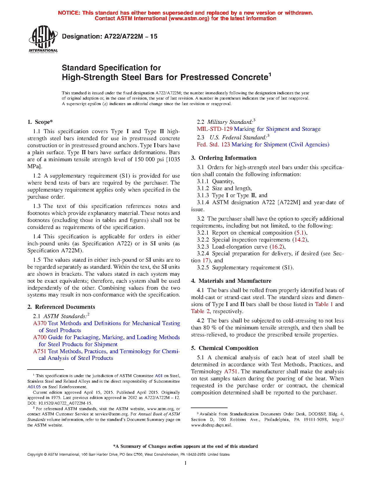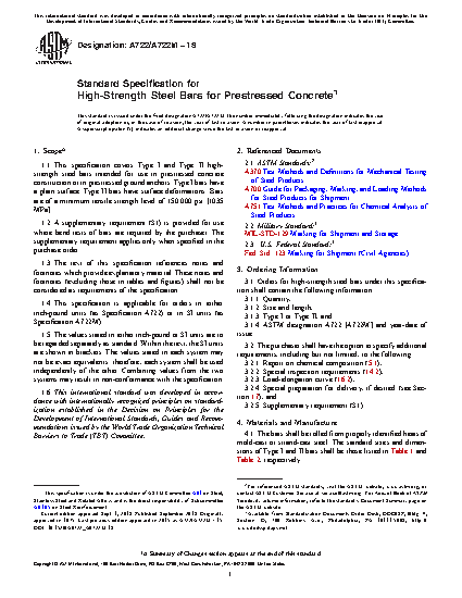 1.1 This specification covers Type I and Type II high-strength steel bars intended for use in prestressed concrete construction or in prestressed ground anchors. Type I bars have a plain surface. Type II bars have surface deformations. Bars are of a minimum tensile strength level of 150 000 psi [1035 MPa].