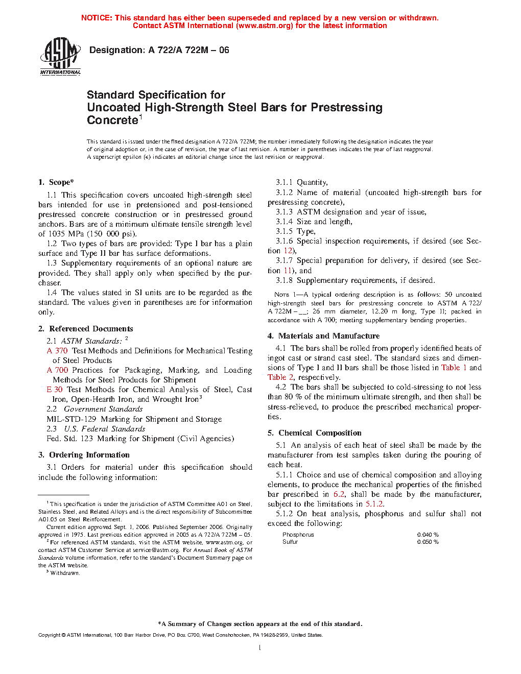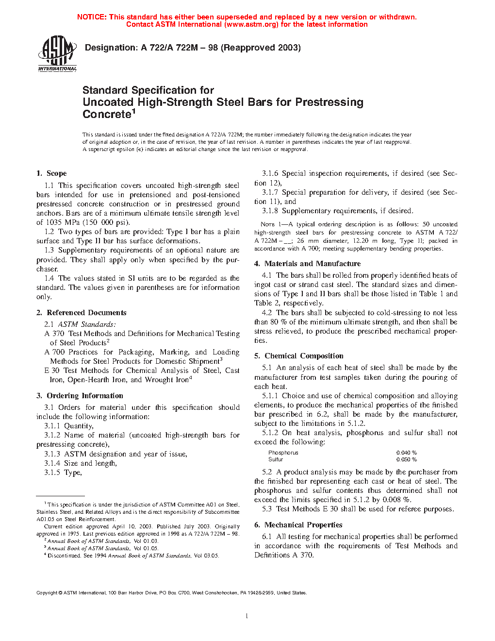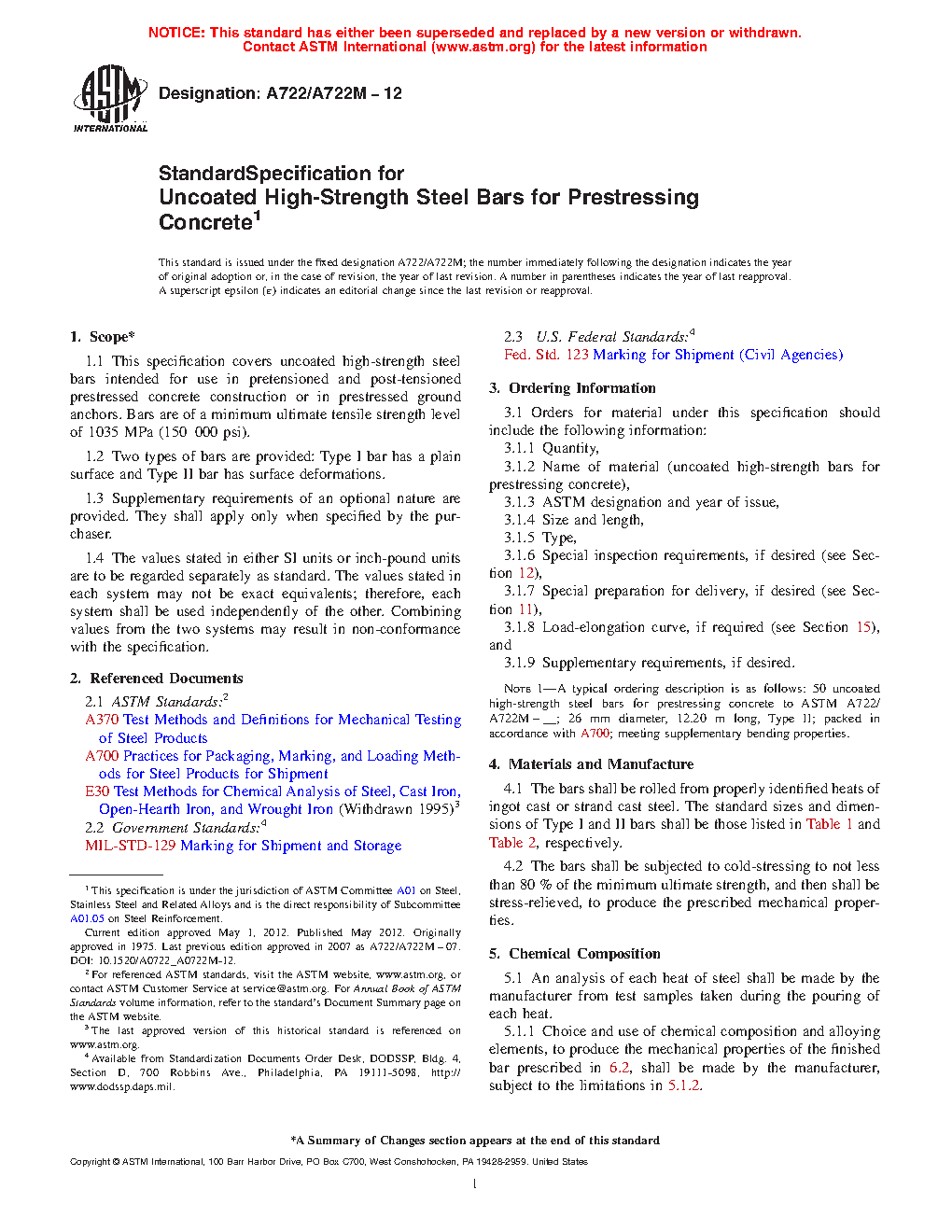1.1 This specification covers Type I and Type II high-strength steel bars intended for use in prestressed concrete construction or in prestressed ground anchors. Type I bars have a plain surface. Type II bars have surface deformations. Bars are of a minimum tensile strength level of 150 000 psi [1035 MPa].