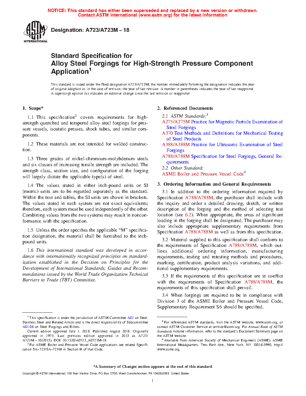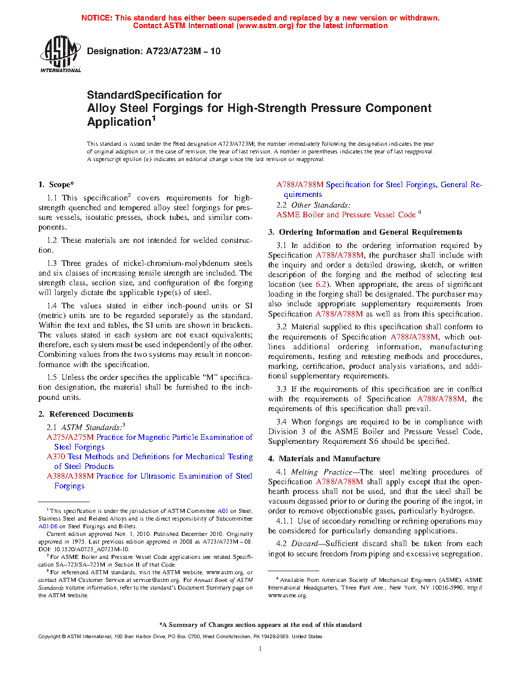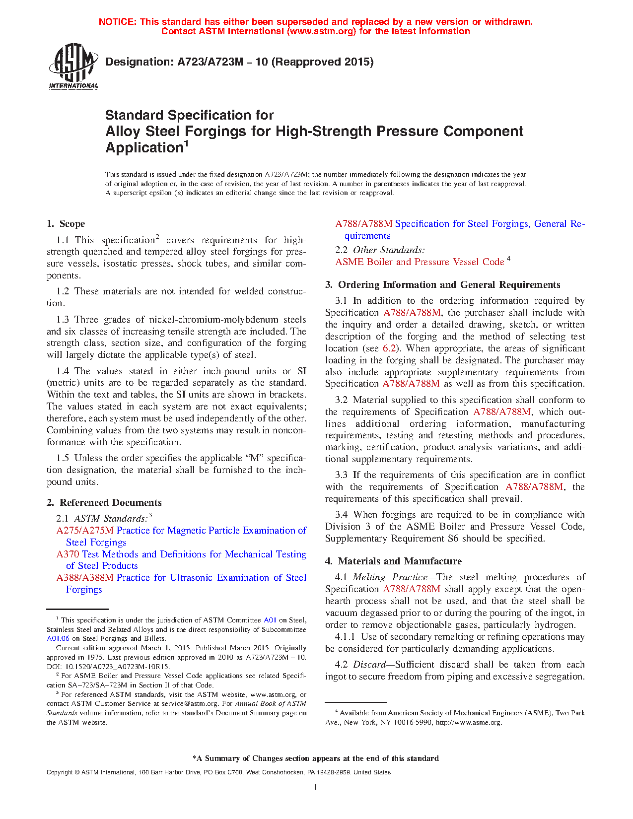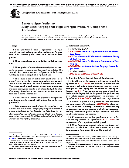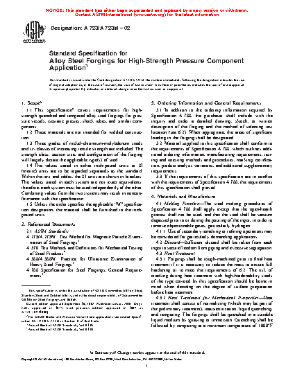 1.1 This specification2 covers requirements for high-strength quenched and tempered alloy steel forgings for pressure vessels, isostatic presses, shock tubes, and similar components.
