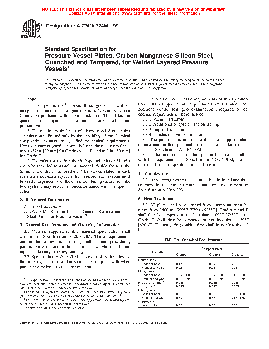 1.1 This specification2 covers three grades of carbon-manganese-silicon steel, designated Grades A, B, and C. Grade C may be produced with a boron addition. The plates are quenched and tempered and are intended for welded-layered pressure vessels.