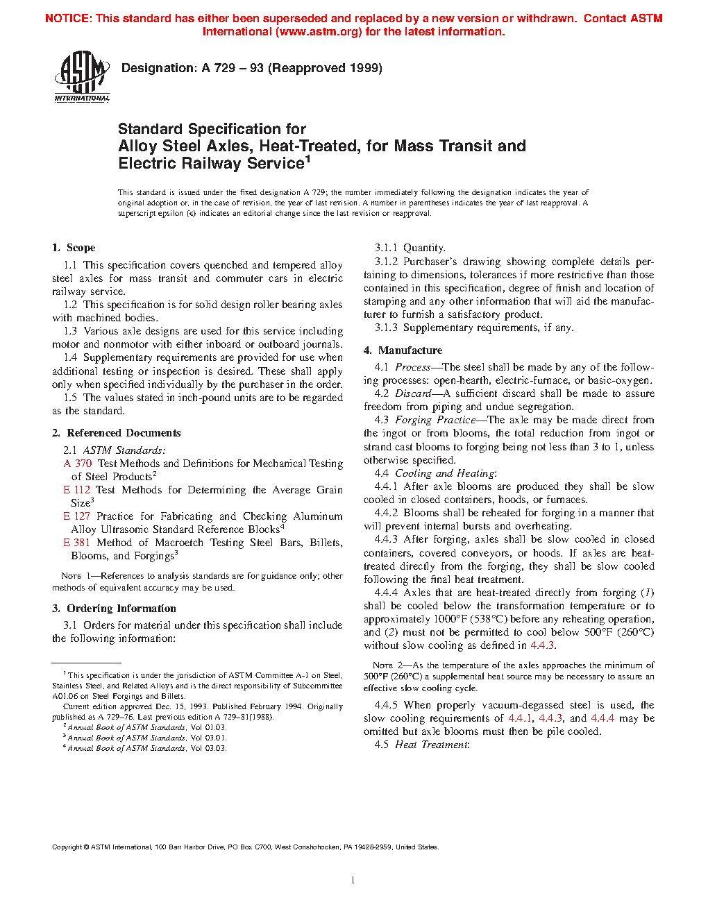 Standard Specification for Alloy Steel Axles, Heat-Treated, for Mass Transit and Electric Railway Service