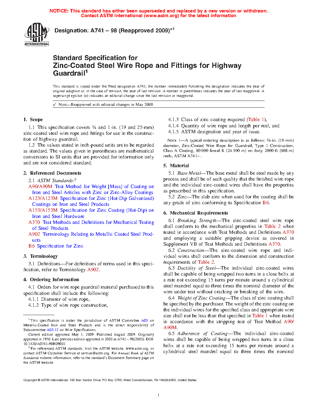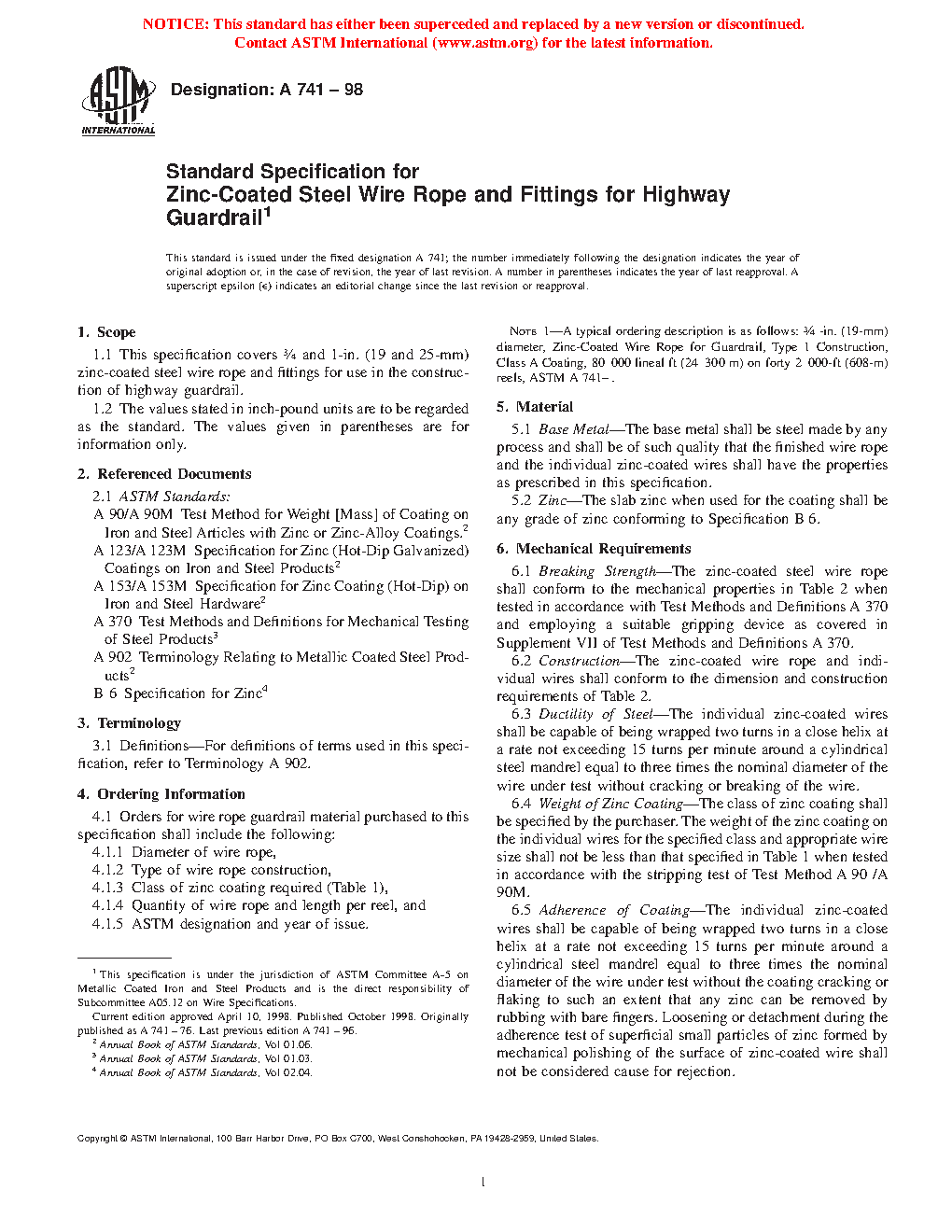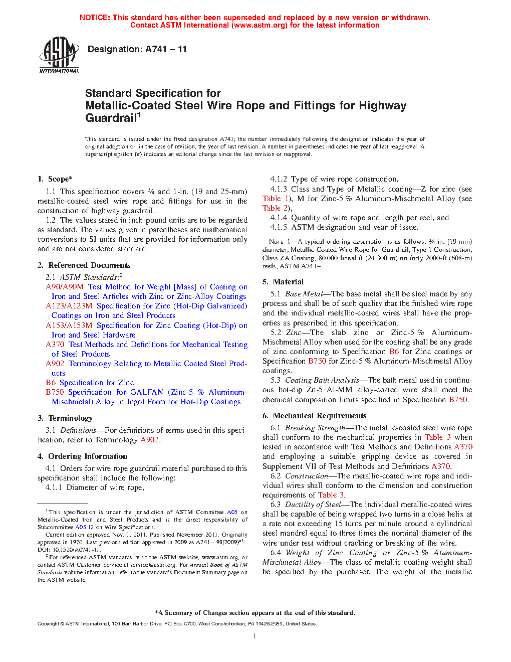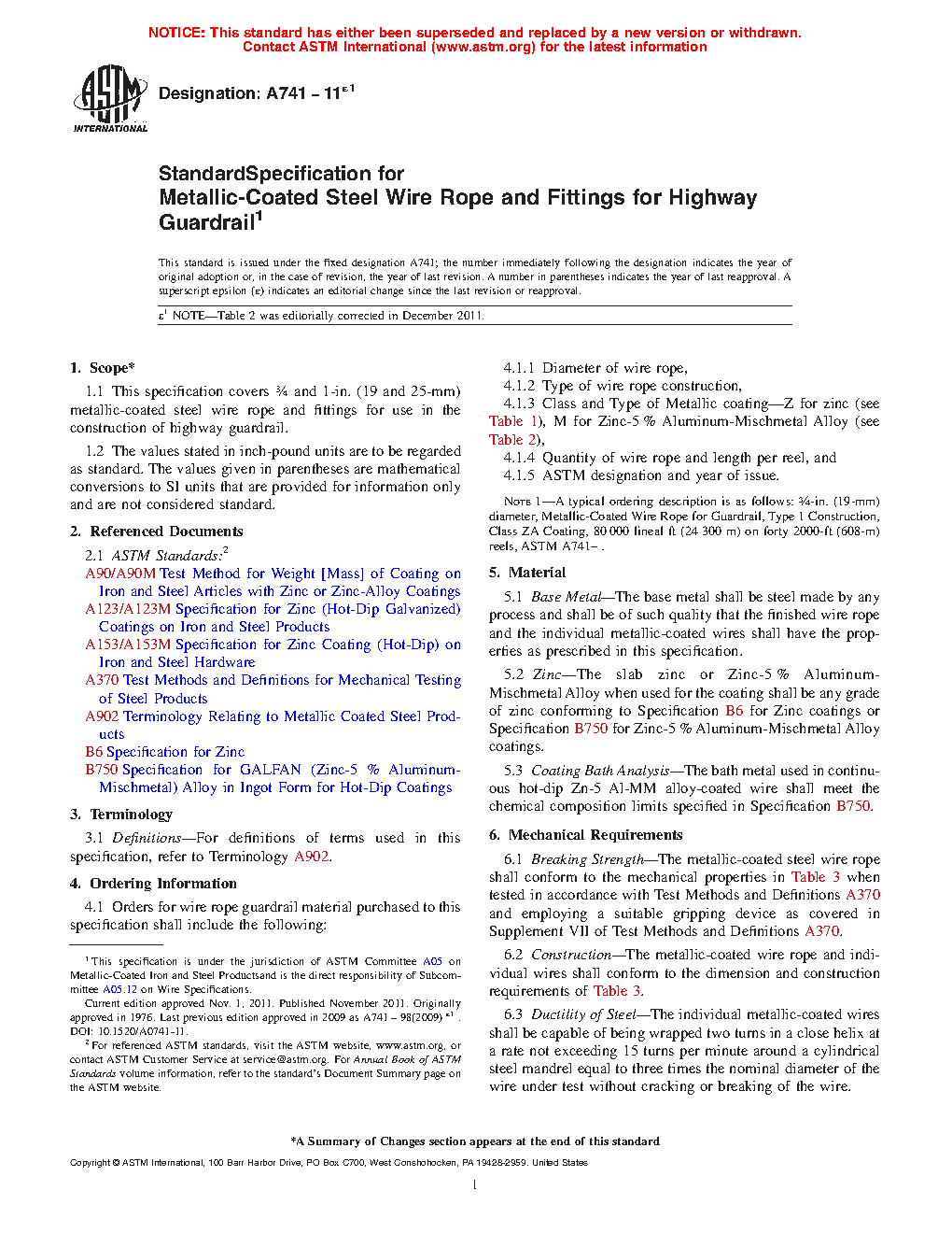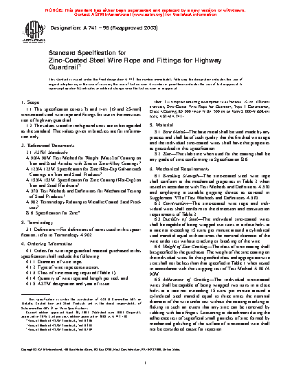 1.1 This specification covers 3/4 and 1-in. (19 and 25-mm) metallic-coated steel wire rope and fittings for use in the construction of highway guardrail.