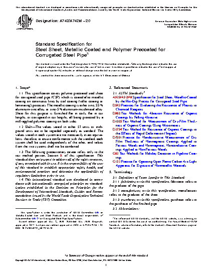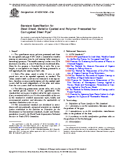 1.1 This specification covers polymer precoated steel sheet for corrugated steel pipe (CSP) which is coated after metallic coating on continuous lines by coil coating (roller coating or laminating) processes. The metallic coating is either zinc, 55 % aluminum-zinc alloy, or zinc-5 % aluminum-mischmetal alloy. Sheet for this purpose is furnished flat in coils, flat in cut lengths, or corrugated in cut lengths, all being protected by a mill-applied polymer coating on both sides.