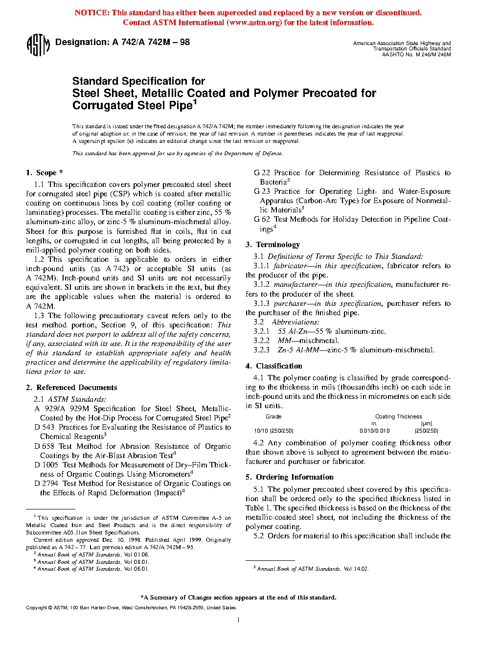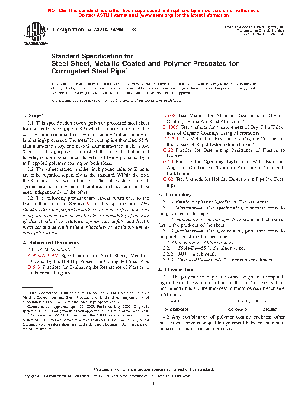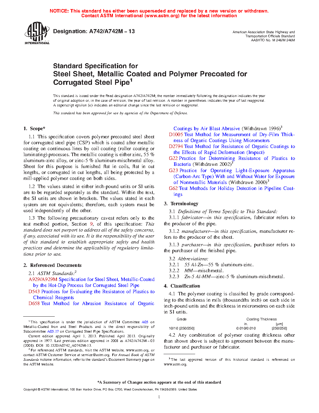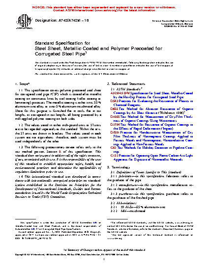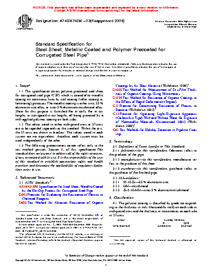 1.1 This specification covers polymer precoated steel sheet for corrugated steel pipe (CSP) which is coated after metallic coating on continuous lines by coil coating (roller coating or laminating) processes. The metallic coating is either zinc, 55 % aluminum-zinc alloy, or zinc-5 % aluminum-mischmetal alloy. Sheet for this purpose is furnished flat in coils, flat in cut lengths, or corrugated in cut lengths, all being protected by a mill-applied polymer coating on both sides.