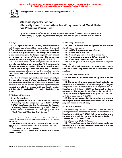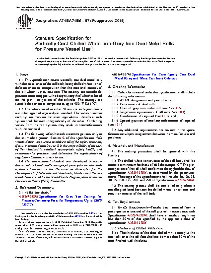 1.1 This specification covers statically cast dual metal rolls with the outer layer of the roll body being chilled white iron of different chemical composition than the core and journals of the roll which is gray cast iron. The castings are suitable for pressure containing parts, the design strength of which is based on the gray iron portion of the cylinder. The castings are suitable for service at temperatures up to 450°F [232°C].