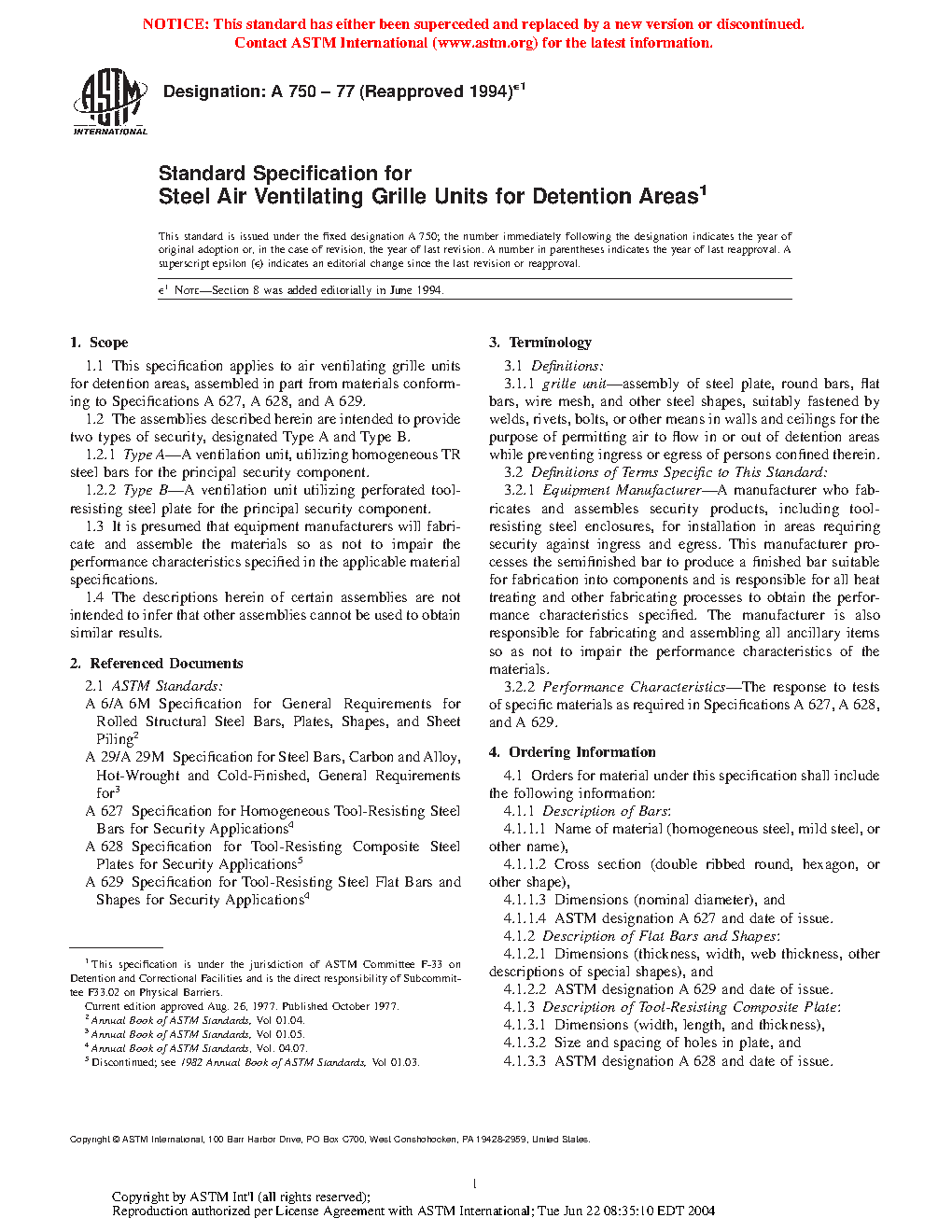 1.1 This specification applies to air ventilating grille units for detention areas, assembled in part from materials conforming to Specifications A627, A628, and A629.
