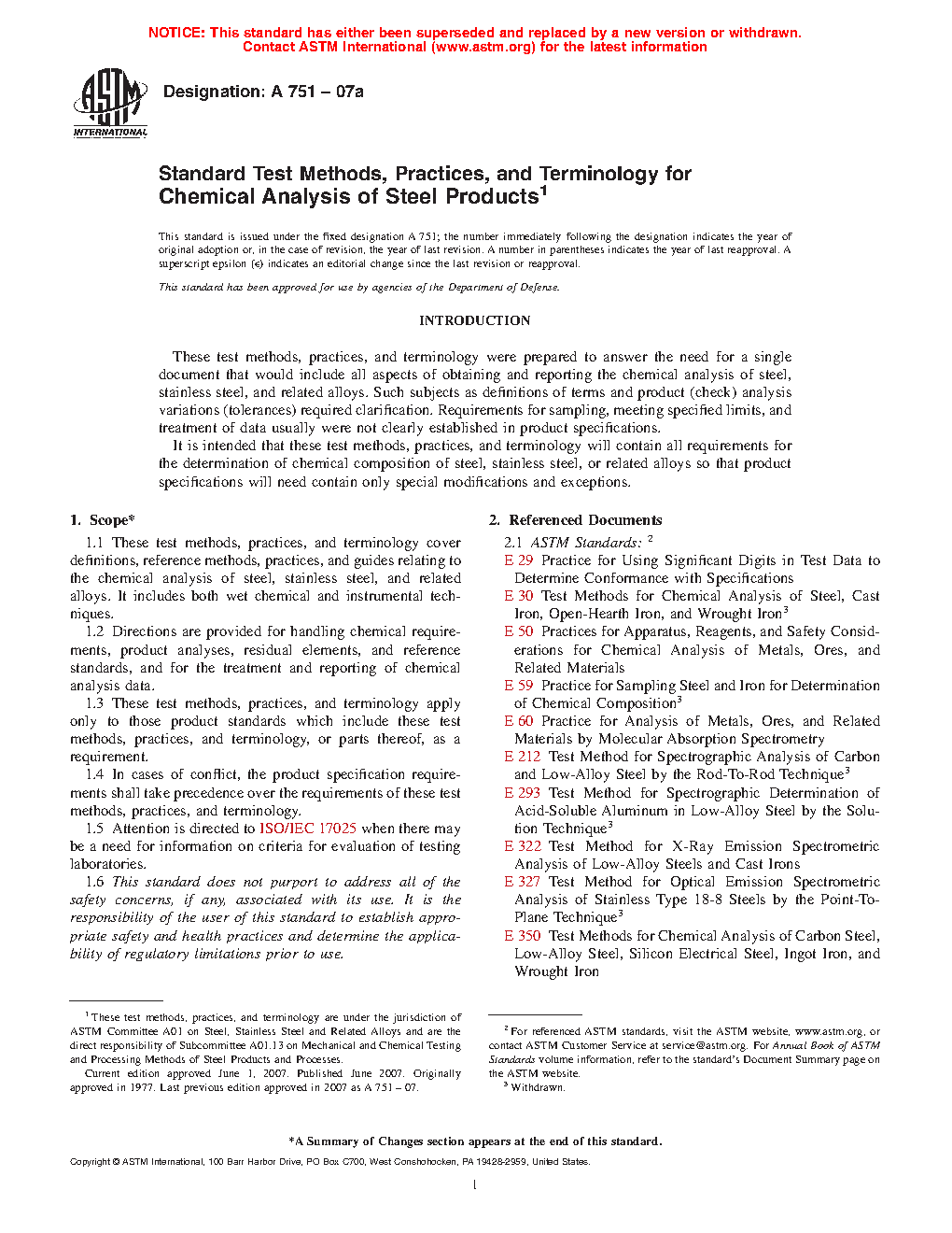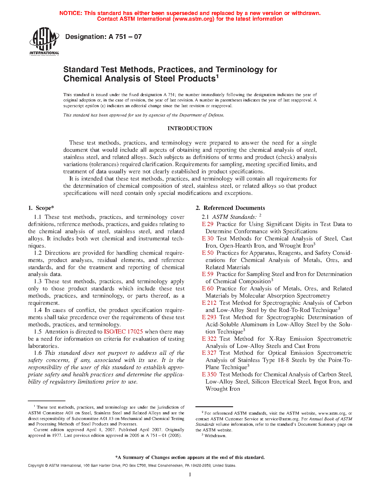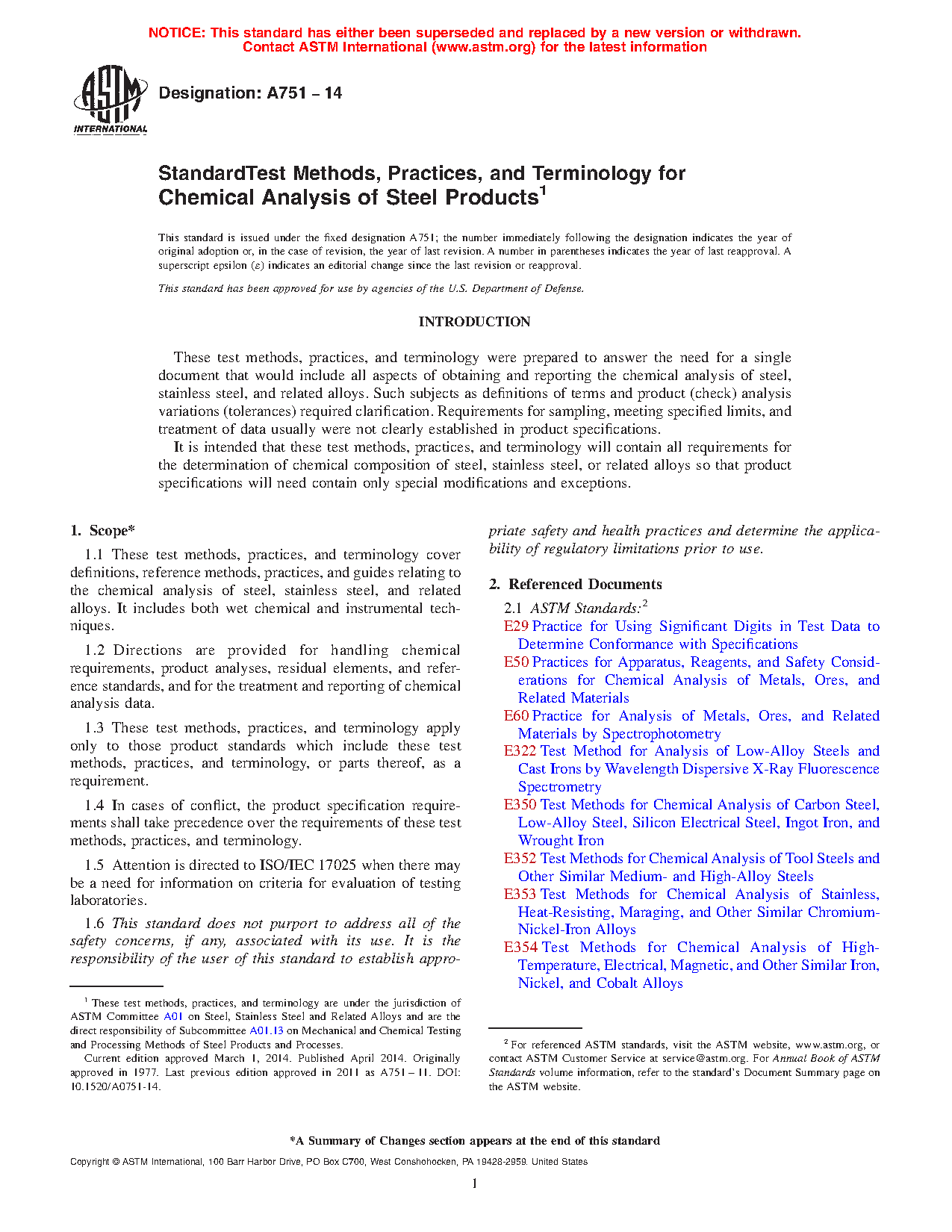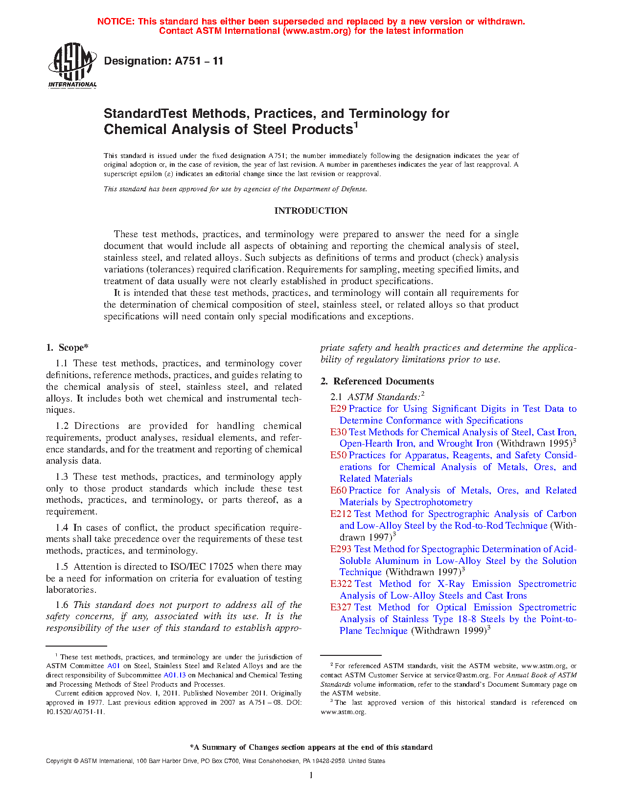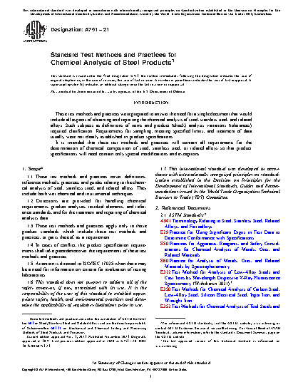 1.1 These test methods, practices, and terminology cover definitions, reference methods, practices, and guides relating to the chemical analysis of steel, stainless steel, and related alloys. It includes both wet chemical and instrumental techniques.