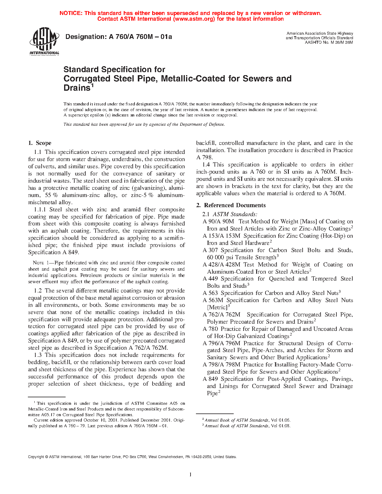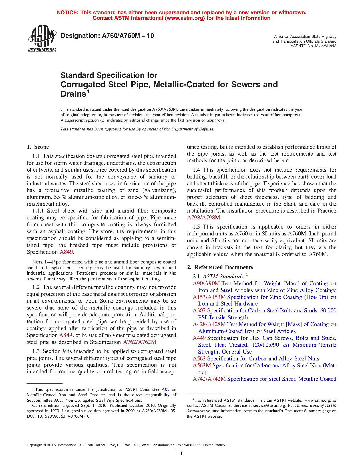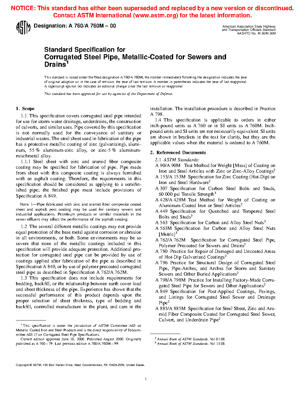 1.2 The several different metallic coatings may not provide equal protection of the base metal against corrosion or abrasion in all environments, or both. Some environments may be so severe that none of the metallic coatings included in this specification will provide adequate protection. Additional protection for corrugated steel pipe can be provided by use of coatings applied after fabrication of the pipe as described in Specification A849, or by use of polymer precoated corrugated steel pipe as described in Specification A762/A762M.