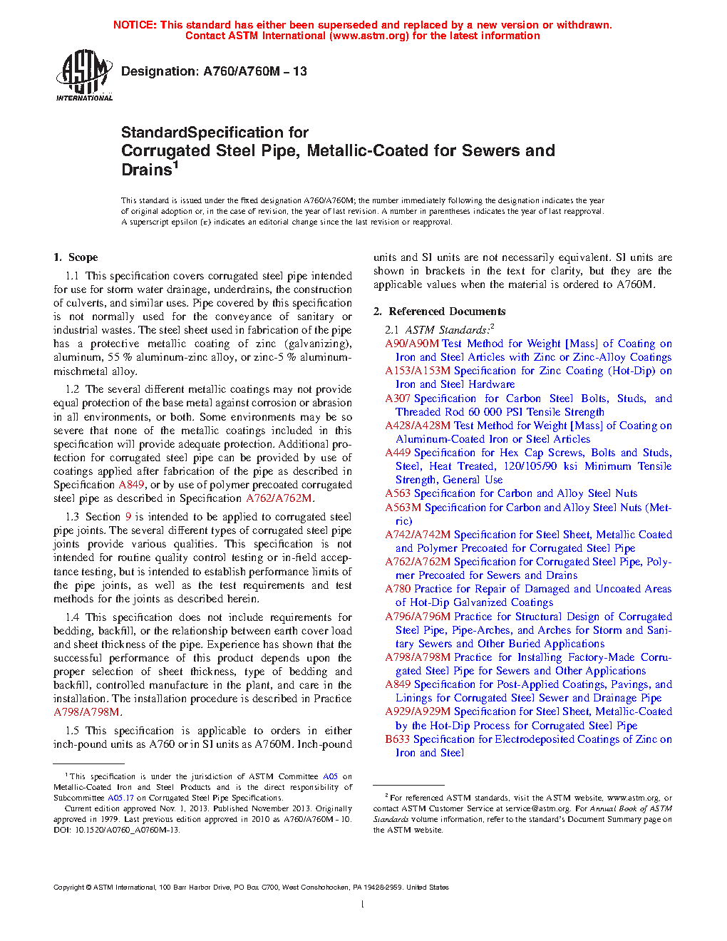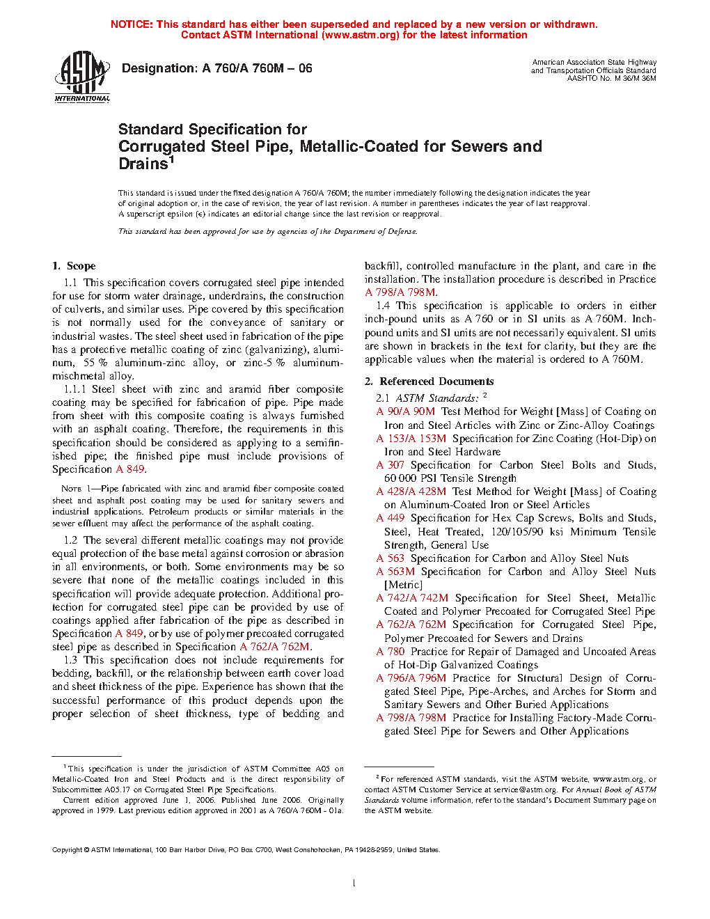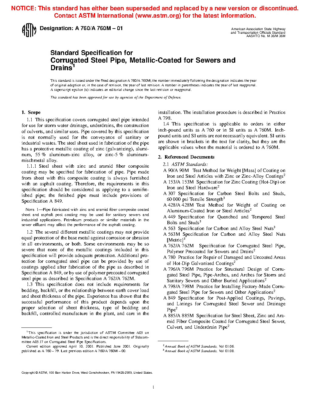 1.2 The several different metallic coatings may not provide equal protection of the base metal against corrosion or abrasion in all environments, or both. Some environments may be so severe that none of the metallic coatings included in this specification will provide adequate protection. Additional protection for corrugated steel pipe can be provided by use of coatings applied after fabrication of the pipe as described in Specification A849, or by use of polymer precoated corrugated steel pipe as described in Specification A762/A762M.