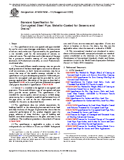 1.1 This specification covers corrugated steel pipe intended for use for storm water drainage, underdrains, the construction of culverts, and similar uses. Pipe covered by this specification is not normally used for the conveyance of sanitary or industrial wastes. The steel sheet used in fabrication of the pipe has a protective metallic coating of zinc (galvanizing), aluminum, 55 % aluminum-zinc alloy, or zinc-5 % aluminum-mischmetal alloy.