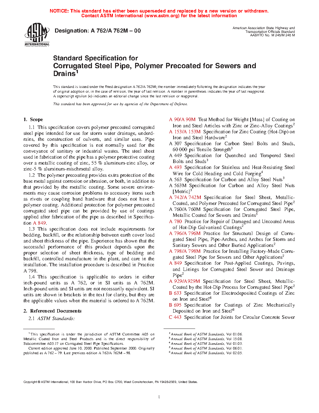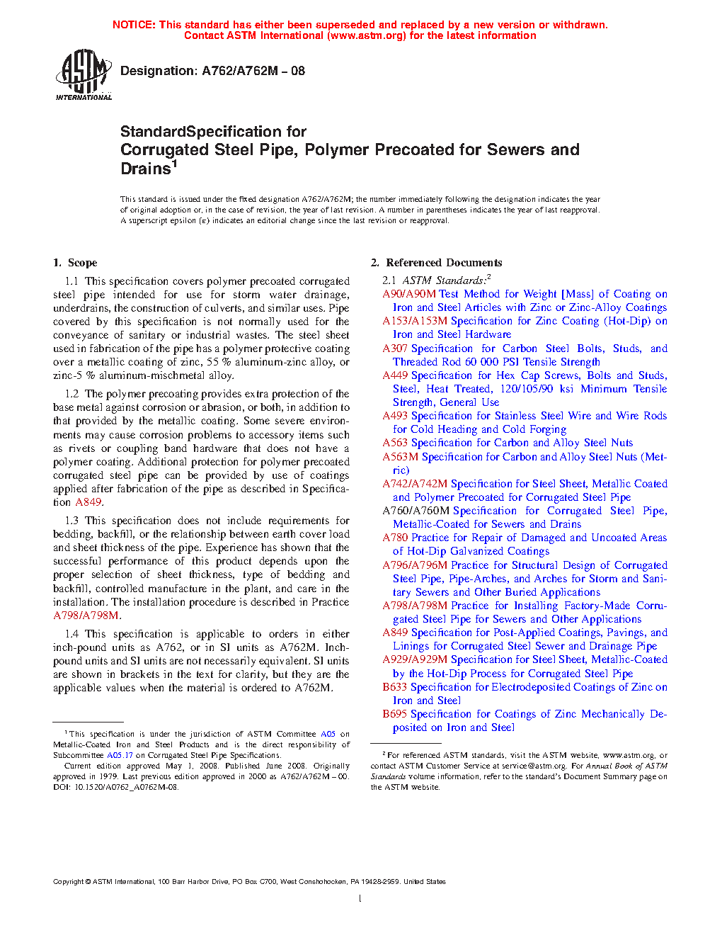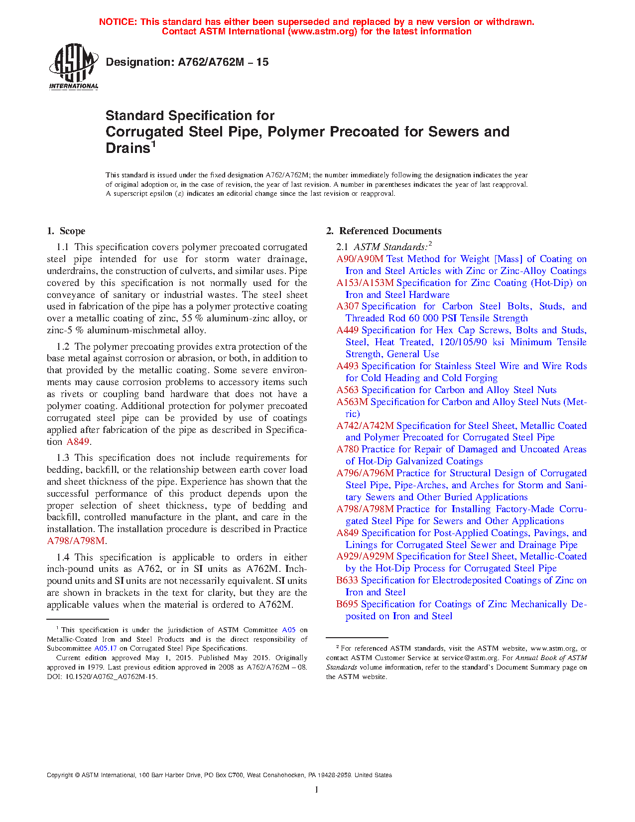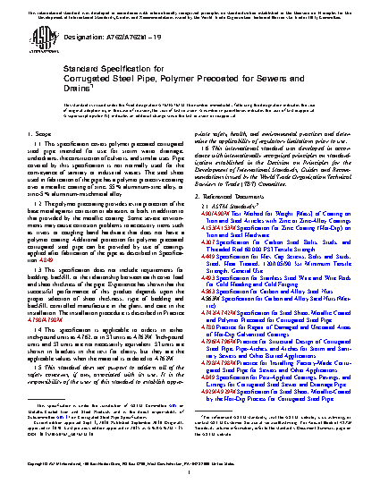 1.1 This specification covers polymer precoated corrugated steel pipe intended for use for storm water drainage, underdrains, the construction of culverts, and similar uses. Pipe covered by this specification is not normally used for the conveyance of sanitary or industrial wastes. The steel sheet used in fabrication of the pipe has a polymer protective coating over a metallic coating of zinc, 55 % aluminum-zinc alloy, or zinc-5 % aluminum-mischmetal alloy.