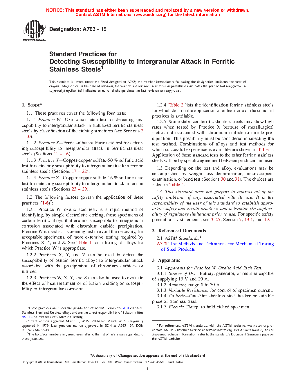 1.1.1 Practice W—Oxalic acid etch test for detecting susceptibility to intergranular attack in stabilized ferritic stainless steels by classification of the etching structures (see Sections 3 – 10).