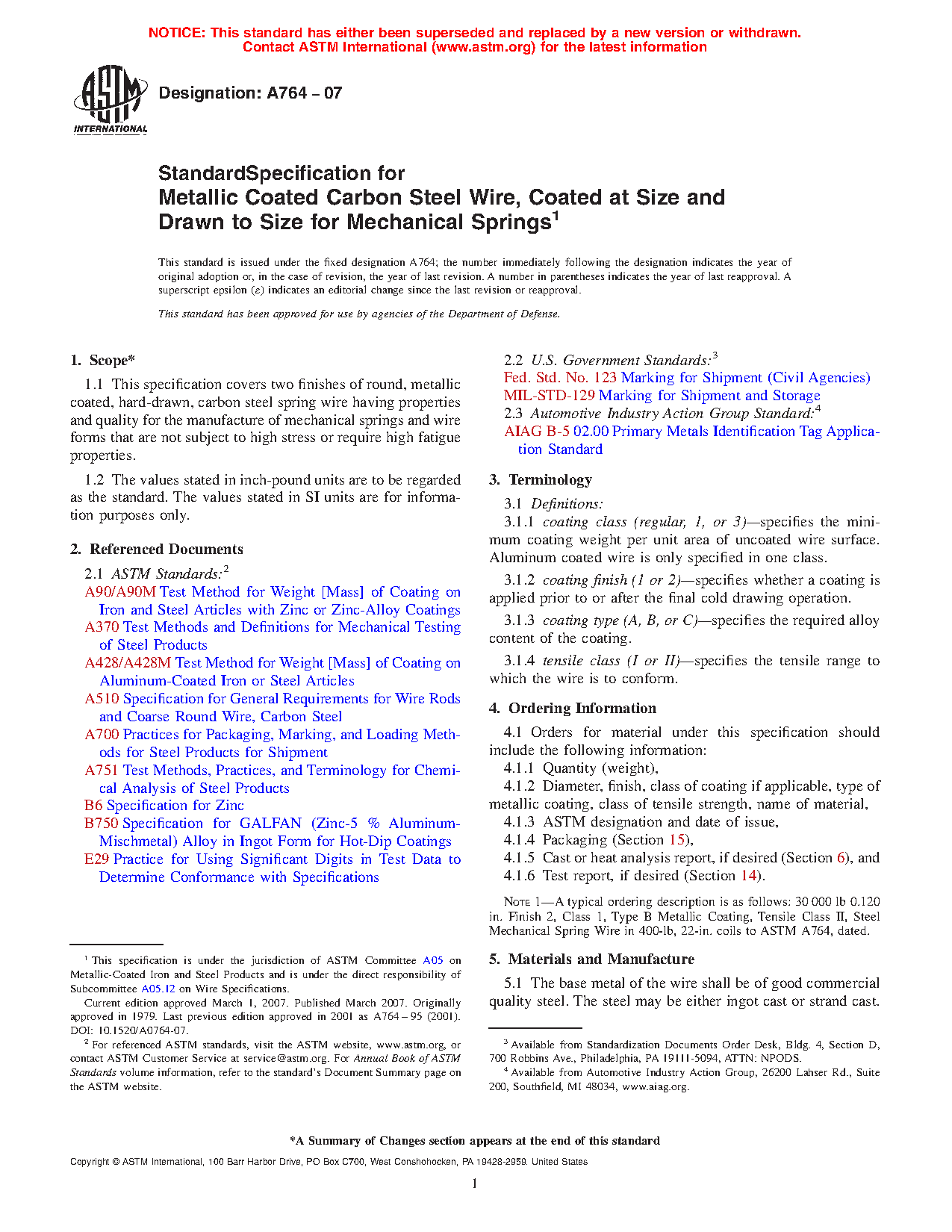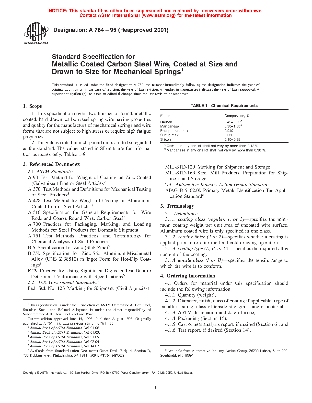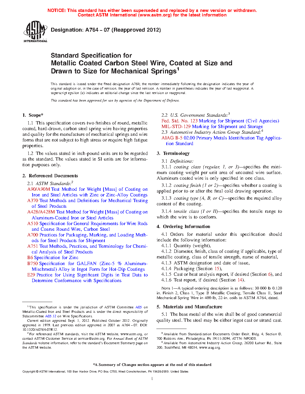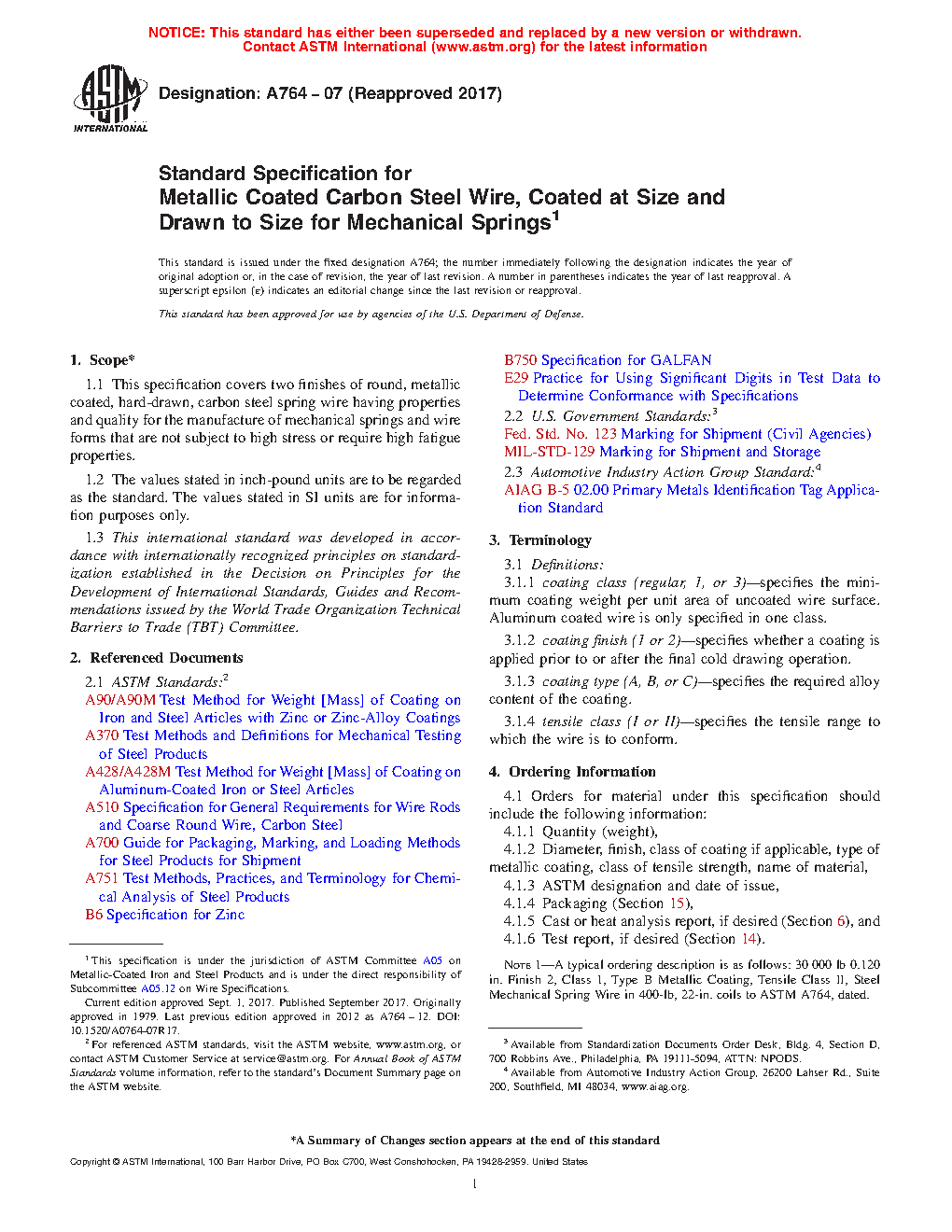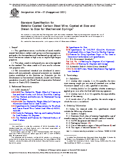 This specification covers round, metallic coated, hard-drawn, carbon steel spring wire having properties and quality for the manufacture of mechanical springs and wire forms that are not subject to high stress or require high fatigue properties. The steel specimens shall be either ingot cast or strand cast and shall be cold drawn. Prior to cold drawing, the specimens shall be furnished into three types of metallic coating: aluminum coating, zinc coating and zinc-aluminum-mischmetal alloy coating categorized as Type A, Type B, and Type C, respectively. The steel shall undergo heat analysis and product analysis wherein the materials shall conform to the requirements of chemical compositions of carbon, manganese, phosphorus, sulfur, and silicon. Tension test, wrap test and metallic coatings test shall be performed wherein the specimens shall conform to the values of tensile strength, Mandrel diameters and minimum weight of aluminum, zinc or zinc-aluminum-mischmetal alloy per unit area of uncoated wire surface.