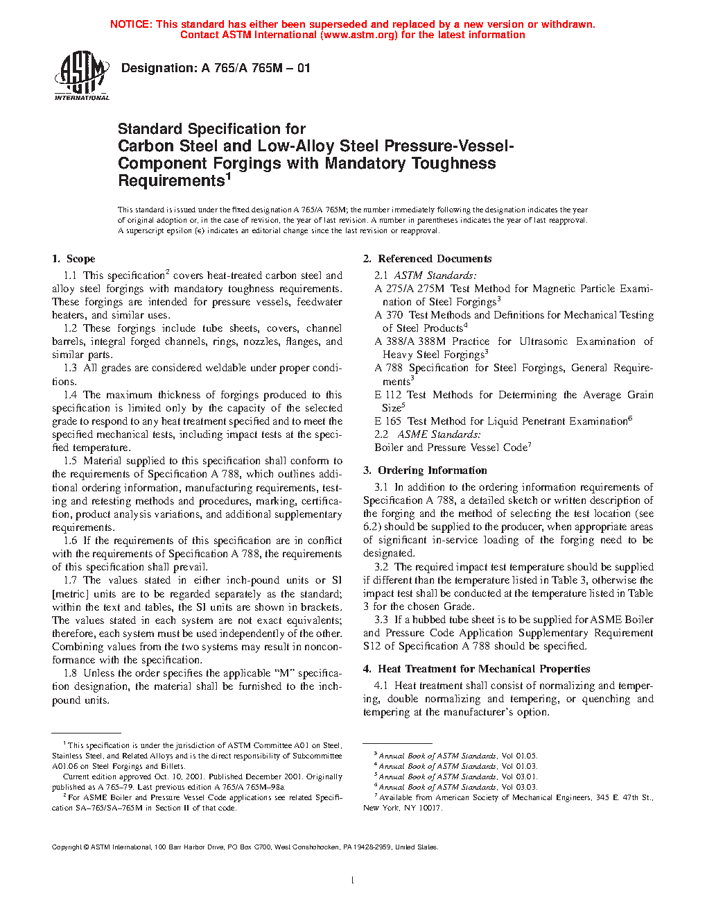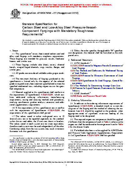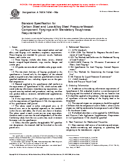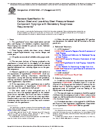1.1 This specification2 covers heat-treated carbon steel and alloy steel forgings with mandatory toughness requirements. These forgings are intended for pressure vessels, feedwater heaters, and similar uses.
