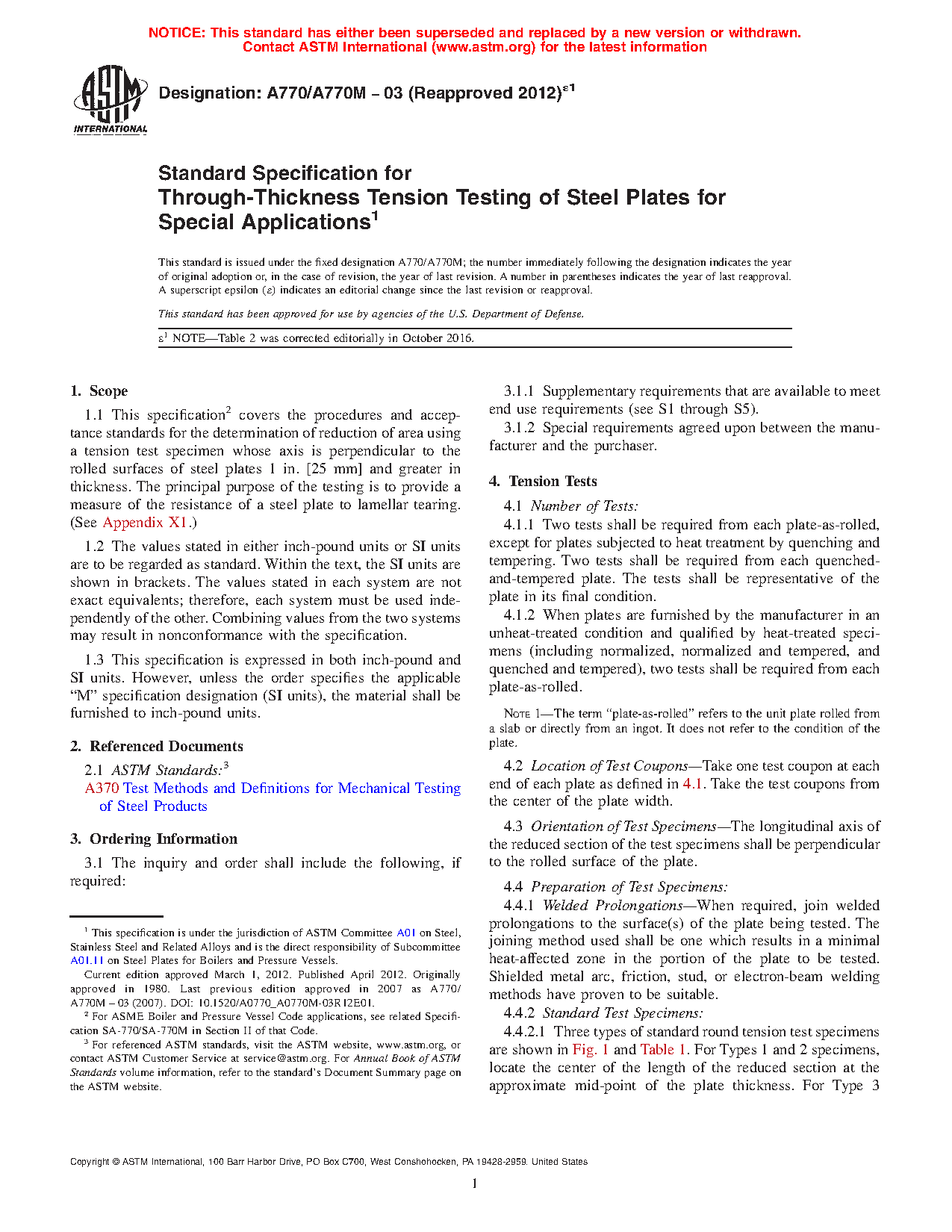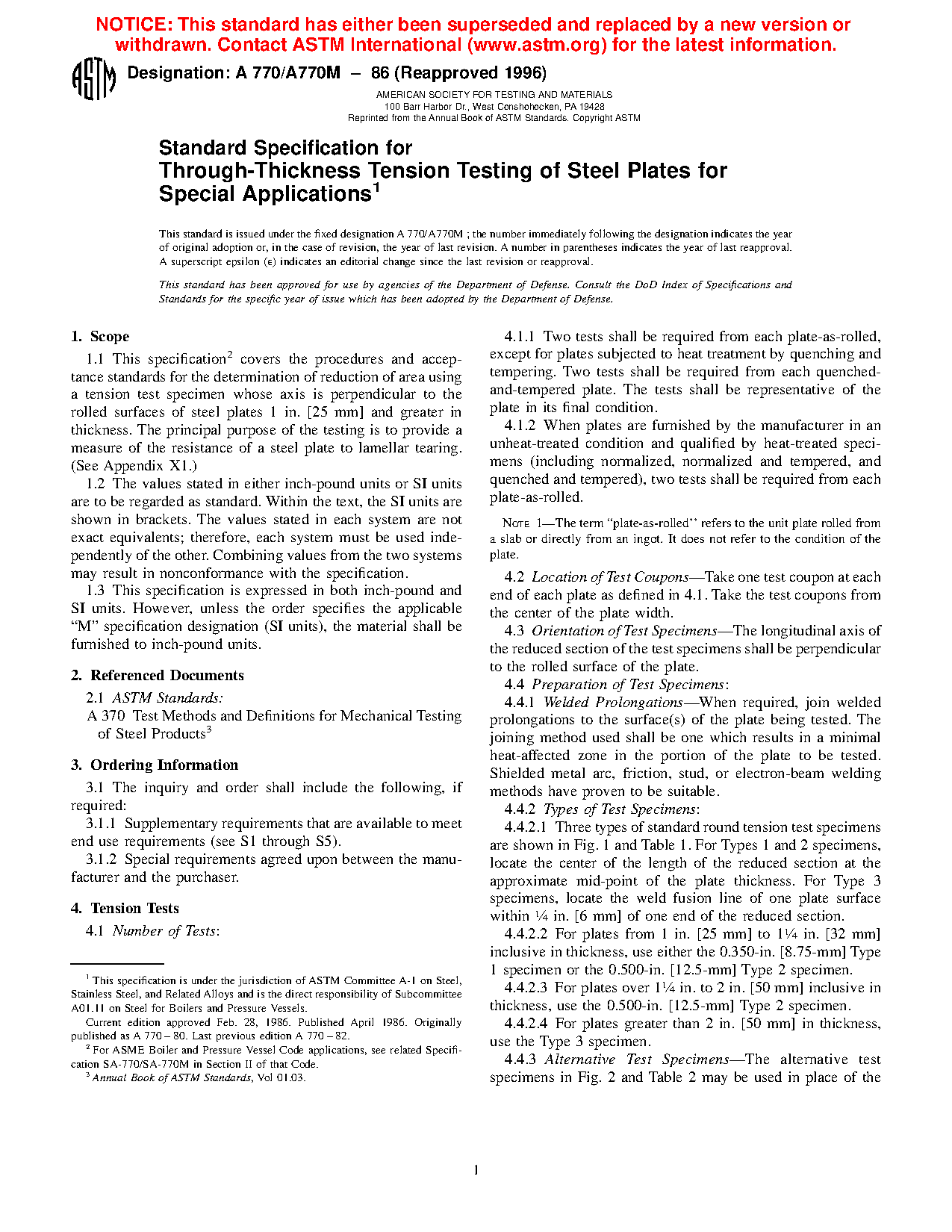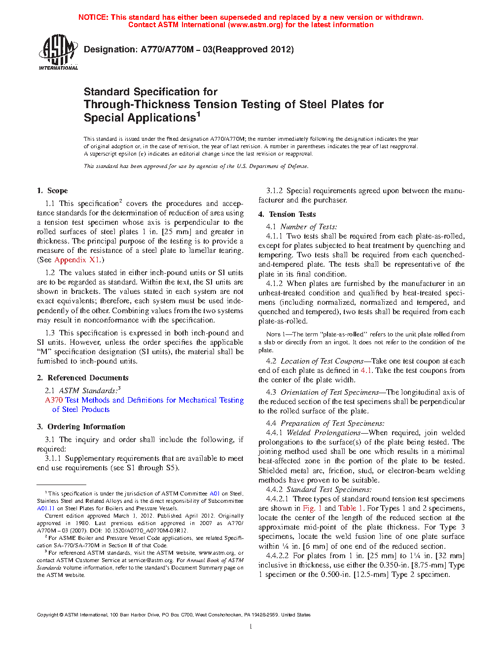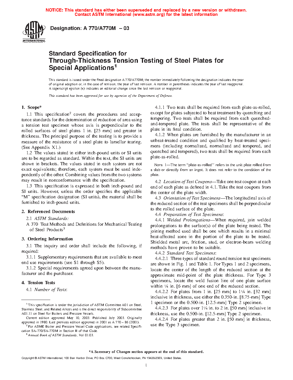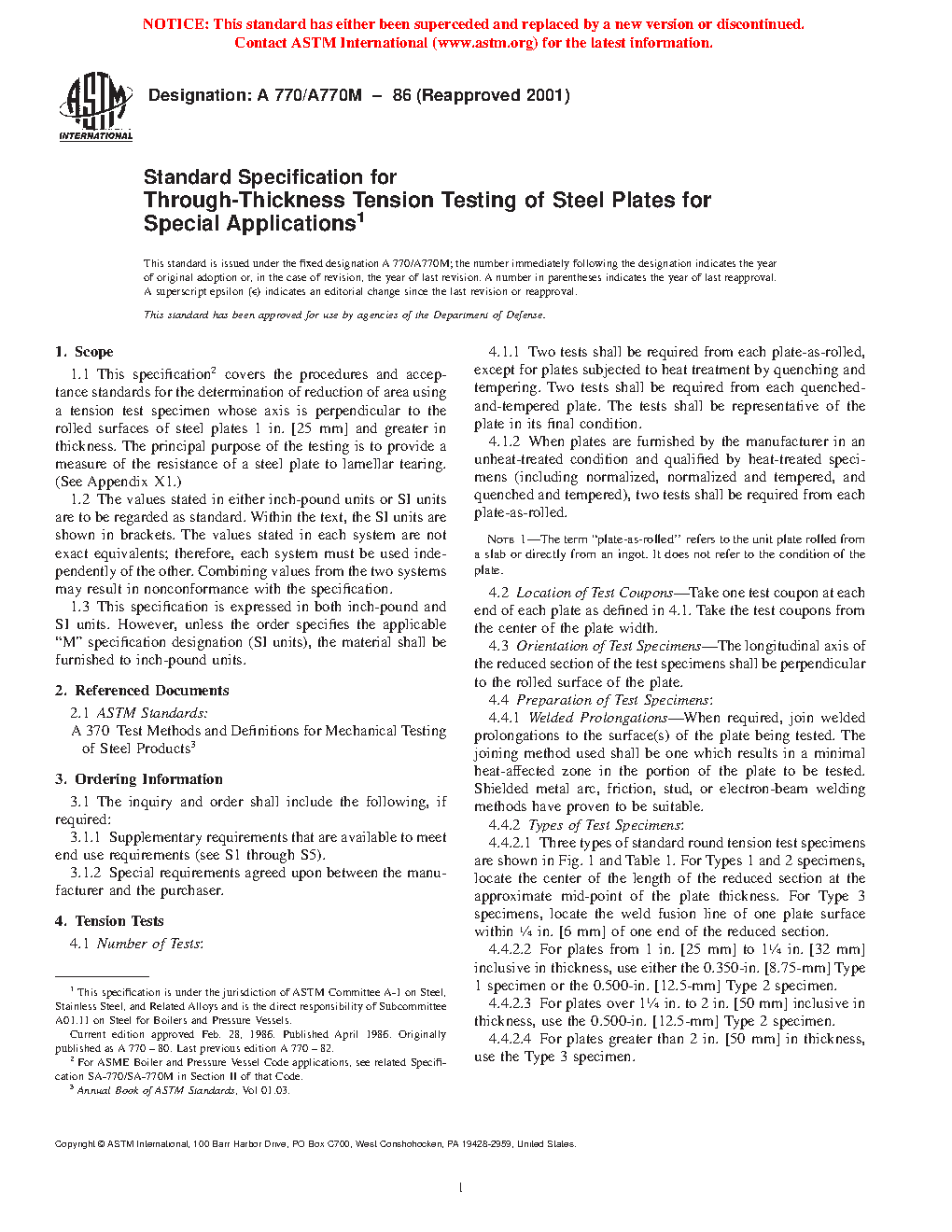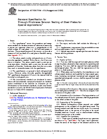 1.1 This specification covers the procedures and acceptance standards for the determination of reduction of area using a tension test specimen whose axis is perpendicular to the rolled surfaces of steel plates 1 in. [25 mm] and greater in thickness. The principal purpose of the testing is to provide a measure of the resistance of a steel plate to lamellar tearing. (See Appendix X1.)