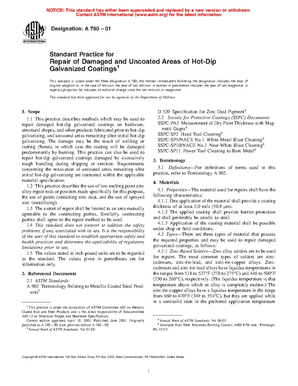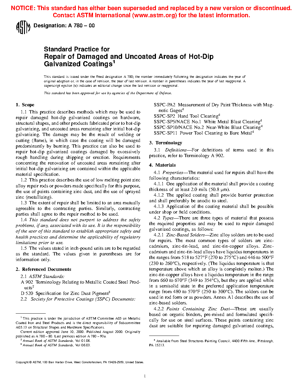 1.1 This practice describes methods that may be used to repair damaged hot-dip galvanized coatings on hardware, structural shapes, and other products fabricated prior to hot-dip galvanizing, and uncoated areas remaining after initial hot-dip galvanizing. The damage may be the result of welding or cutting (flame), in which case the coating will be damaged predominantly by burning. This practice can also be used to repair hot-dip galvanized coatings damaged by excessively rough handling during shipping or erection. Requirements concerning the renovation of uncoated areas remaining after initial hot-dip galvanizing are contained within the applicable material specification.
