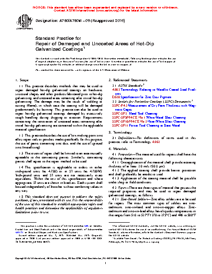 1.1 This practice describes methods that may be used to repair damaged hot-dip galvanized coatings on hardware, structural shapes, and other products fabricated prior to hot-dip galvanizing, and uncoated areas remaining after initial hot-dip galvanizing. The damage may be the result of welding or cutting (flame), in which case the coating will be damaged predominantly by burning. This practice can also be used to repair hot-dip galvanized coatings damaged by excessively rough handling during shipping or erection. Requirements concerning the renovation of uncoated areas remaining after initial hot-dip galvanizing are contained within the applicable material specification.