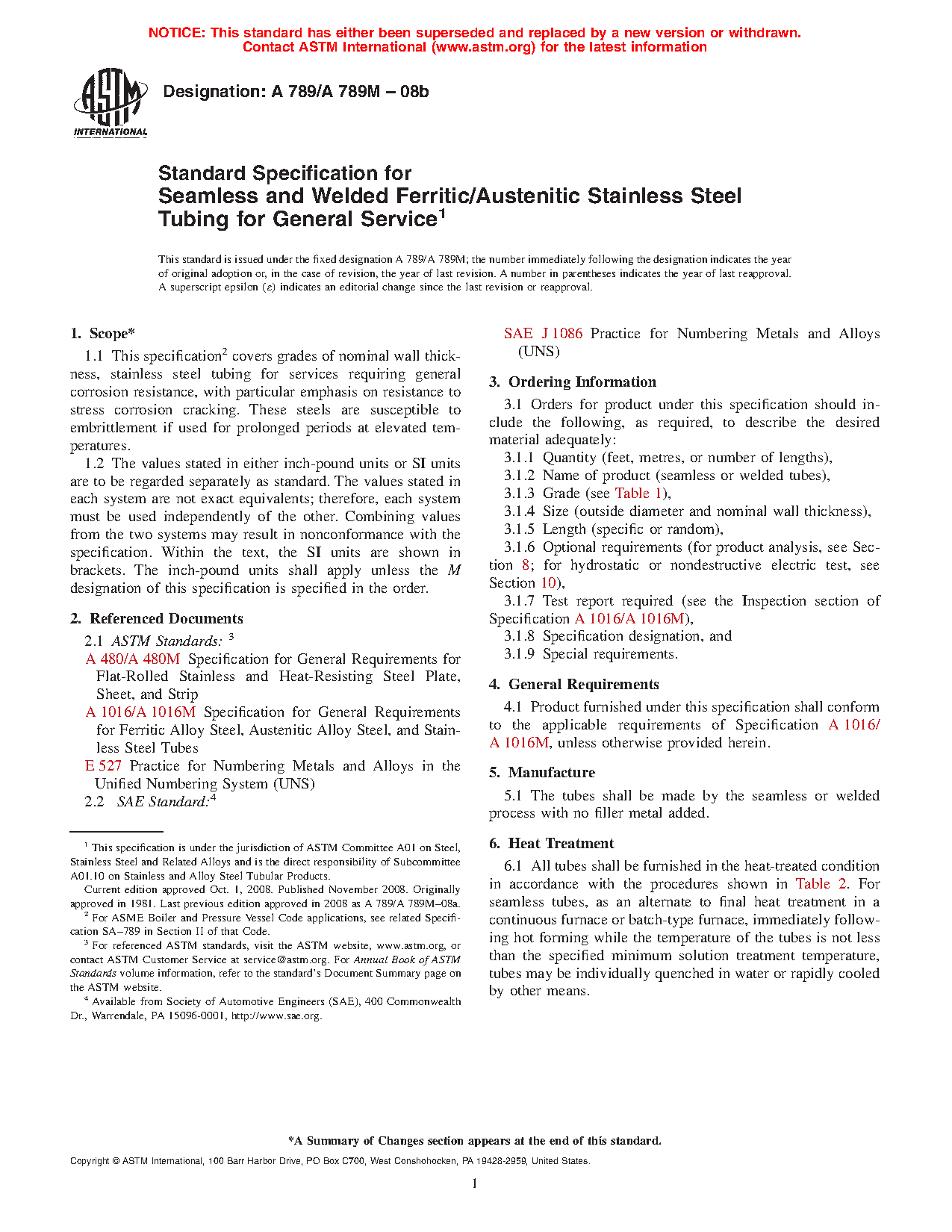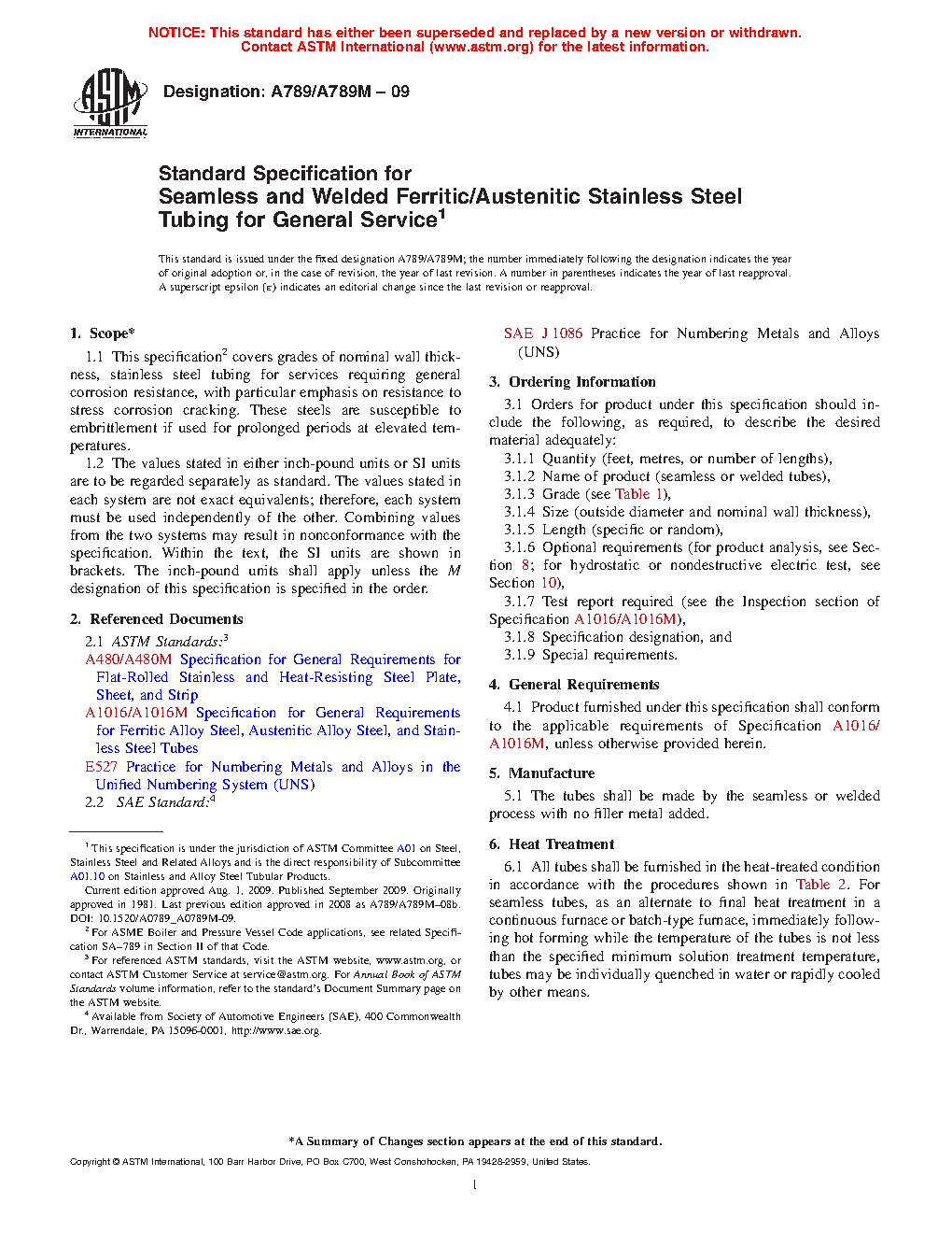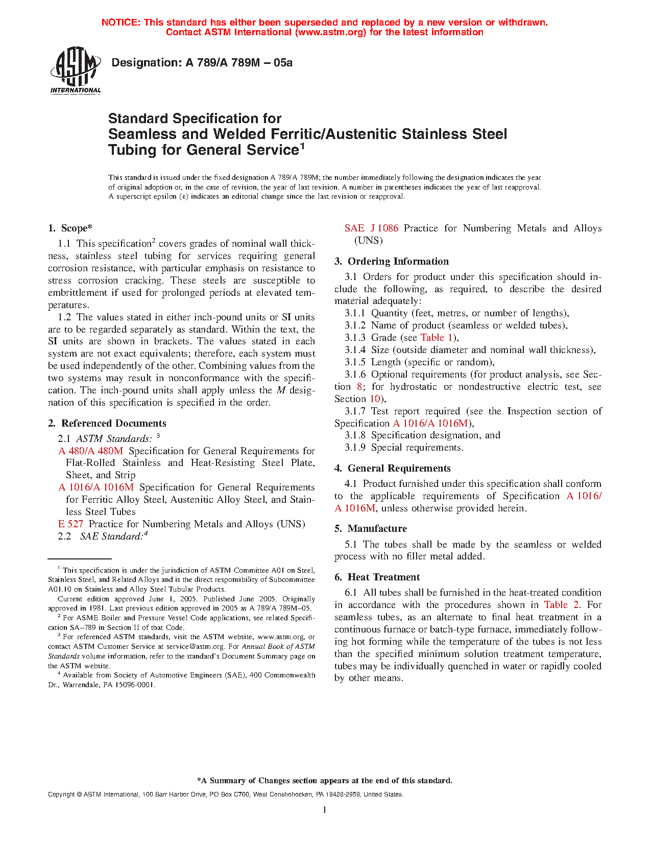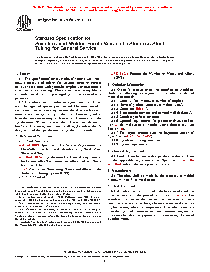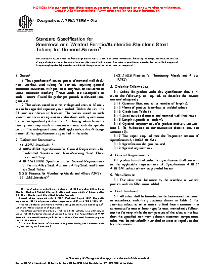 1.1 This specification² covers grades of nominal wall thickness, stainless steel tubing for services requiring general corrosion resistance, with particular emphasis on resistance to stress corrosion cracking. These steels are susceptible to embrittlement if used for prolonged periods at elevated temperatures.