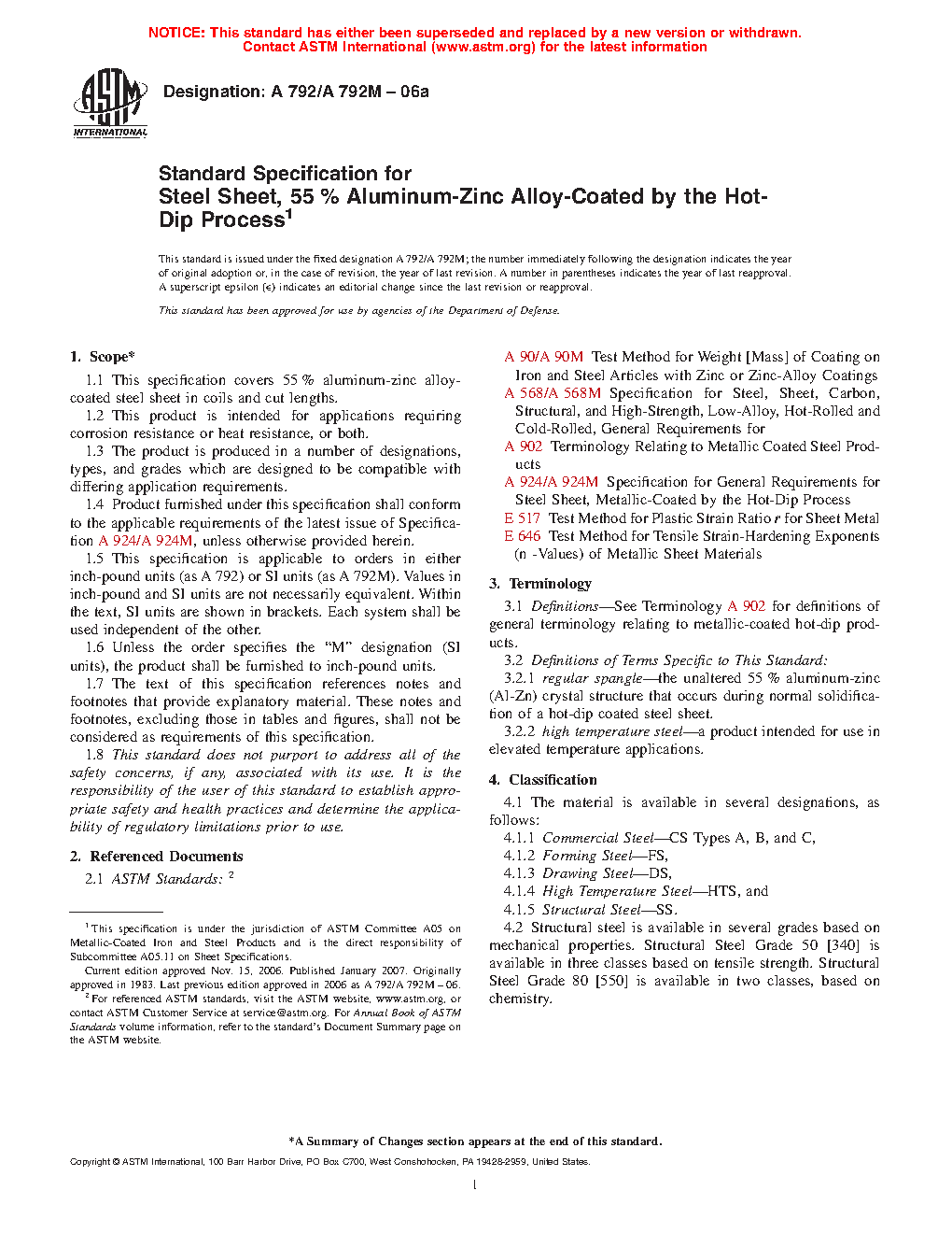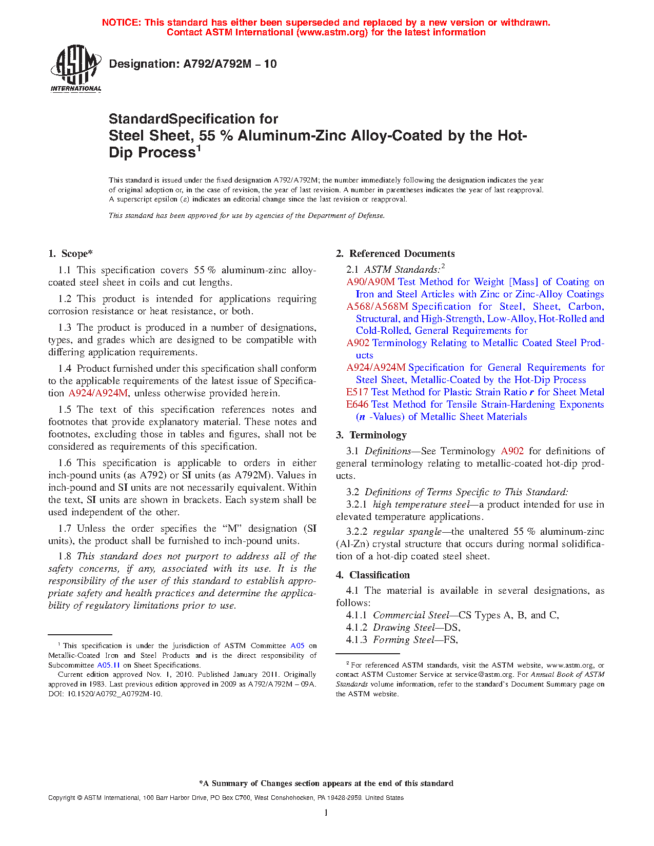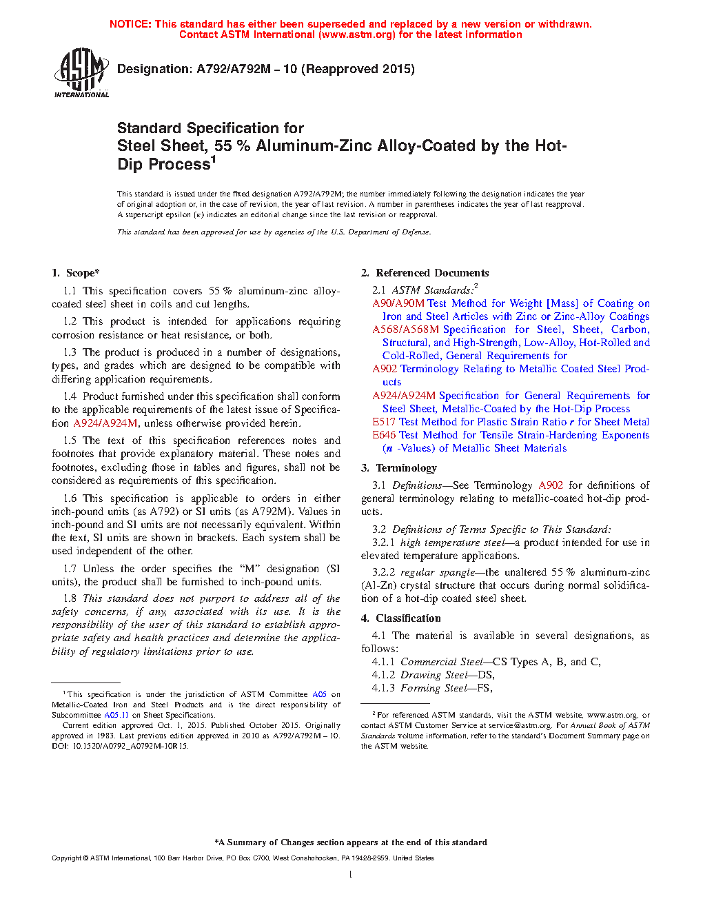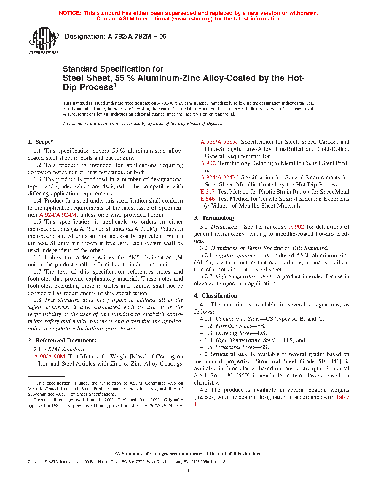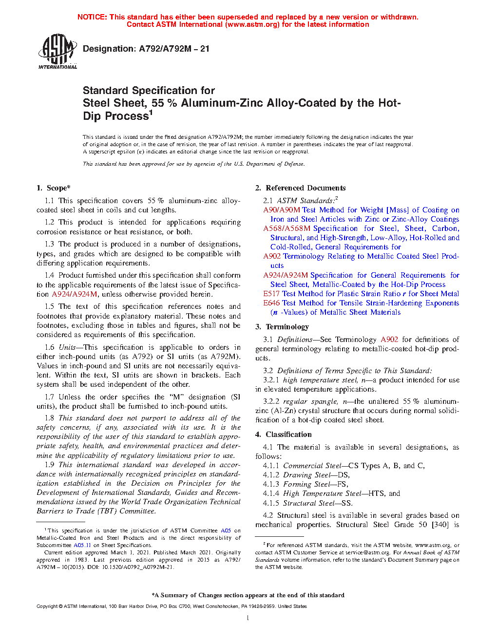 1.1 This specification covers 55 % aluminum-zinc alloy-coated steel sheet in coils and cut lengths available in two types of aluminum-zinc alloy coating applied by the hot-dip process with several coating weights [masses]. Type 1 is Al-Zn-Si alloy-coated, and Type 2 is Al-Zn-Mg-Si alloy-coated.