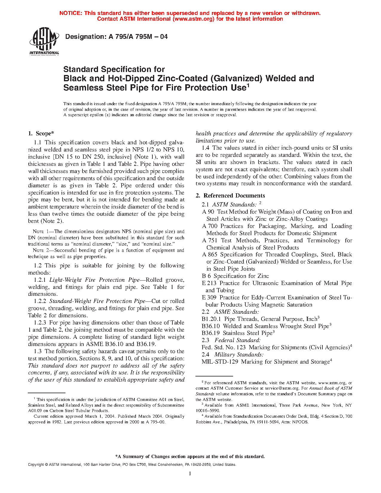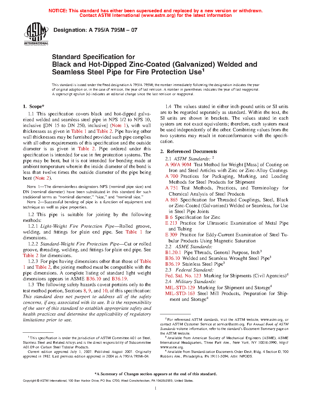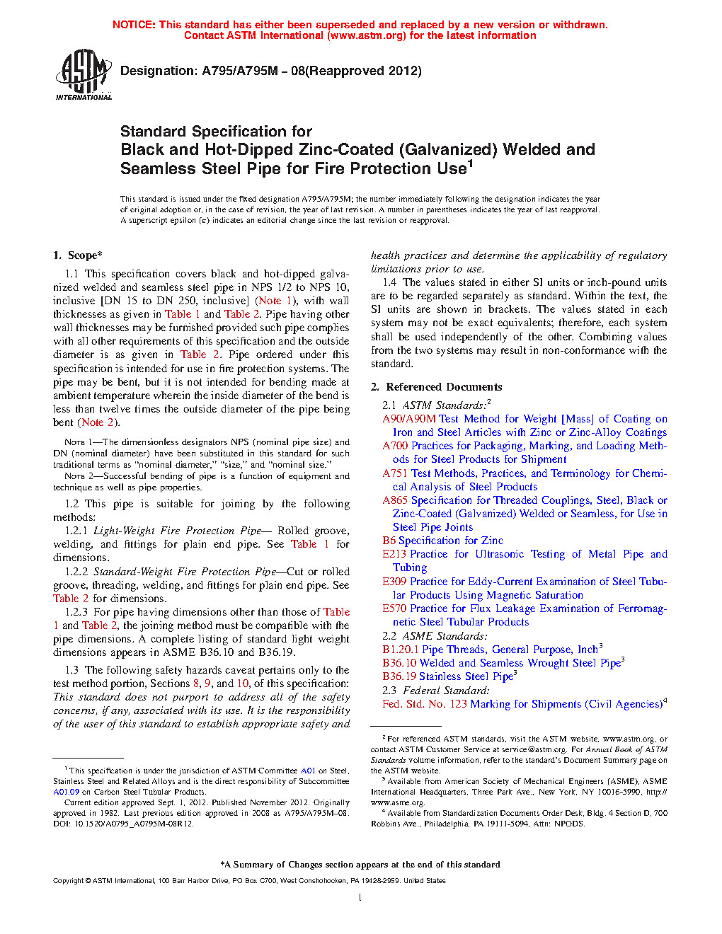 1.2.1 Light-Weight Fire Protection Pipe—Rolled groove, welding, and fittings for plain end pipe. See Table 1 for dimensions.