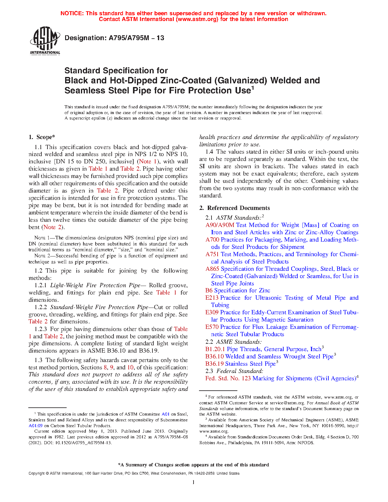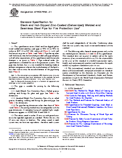 1.1 This specification covers black and hot-dipped galvanized welded and seamless steel pipe in NPS 1/2 to NPS 10, inclusive [DN 15 to DN 250, inclusive] (Note 1), with wall thicknesses as given in Table 1 and Table 2. Pipe having other wall thicknesses may be furnished provided such pipe complies with all other requirements of this specification and the outside diameter is as given in Table 2. Pipe ordered under this specification is intended for use in fire protection systems. The pipe may be bent, but it is not intended for bending made at ambient temperature wherein the inside diameter of the bend is less than twelve times the outside diameter of the pipe being bent (Note 2).