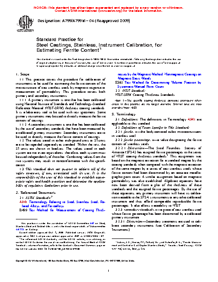 1.1 This practice covers the procedure for calibration of instruments to be used for estimating the ferrite content of the microstructure of cast stainless steels by magnetic response or measurement of permeability. This procedure covers both primary and secondary instruments.