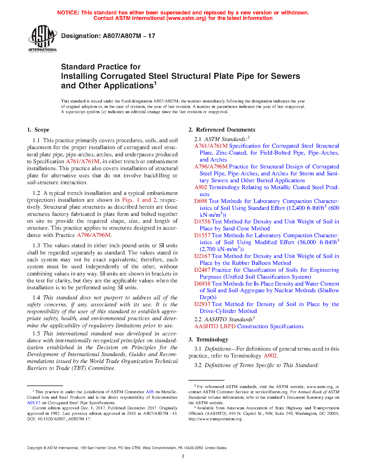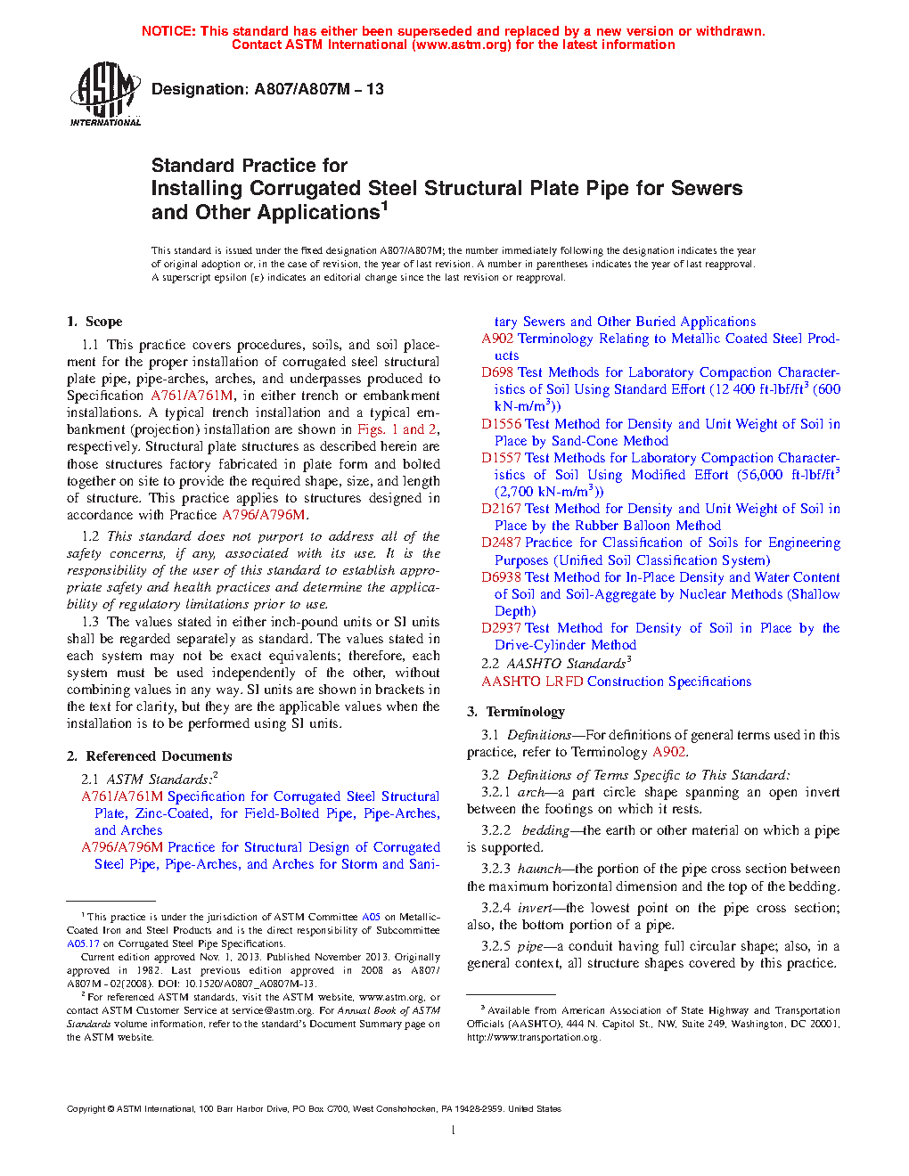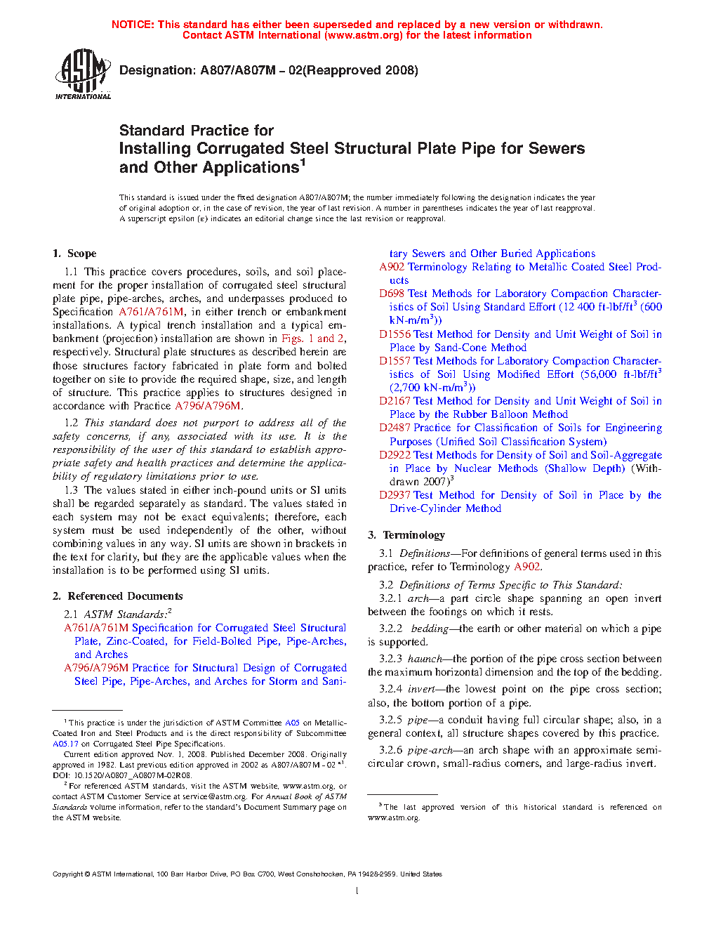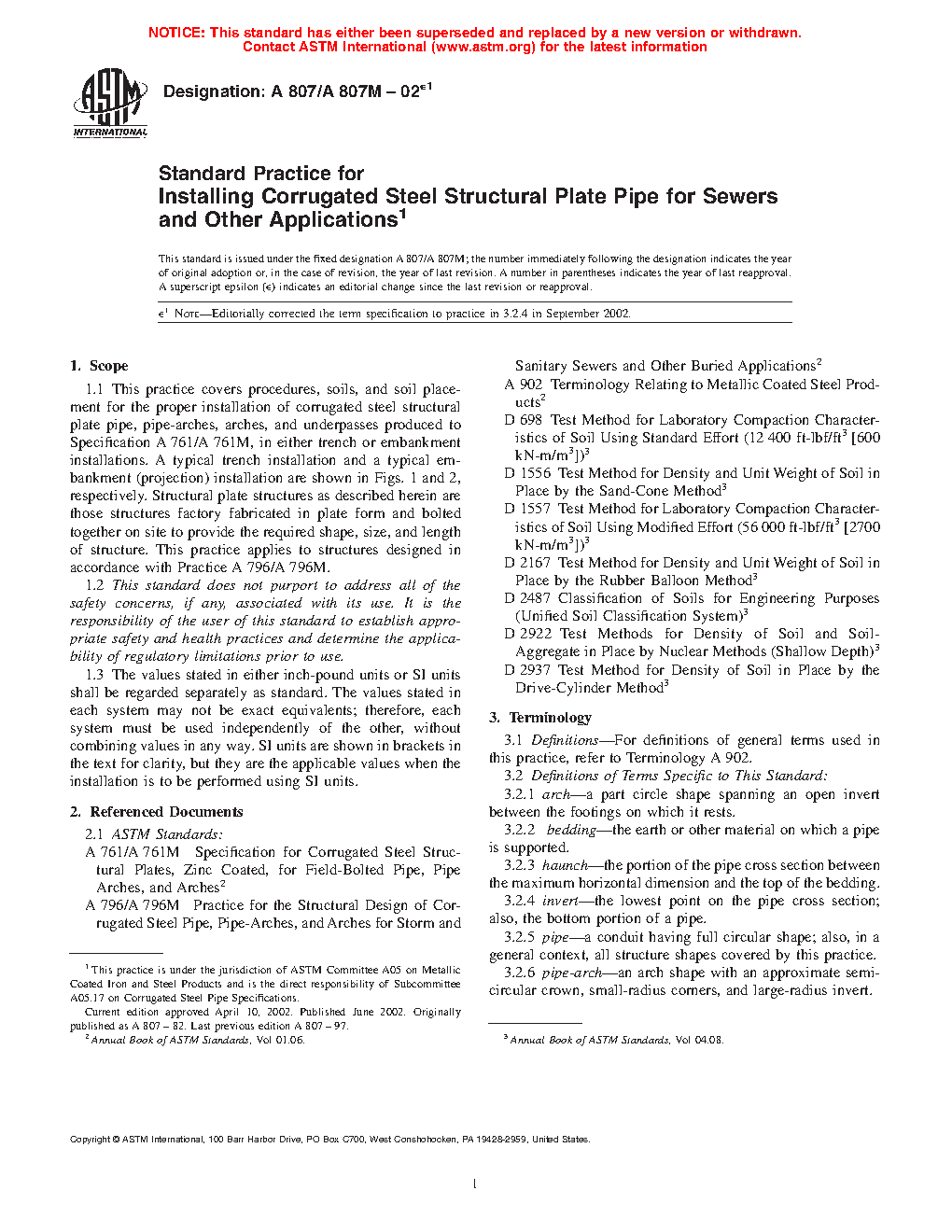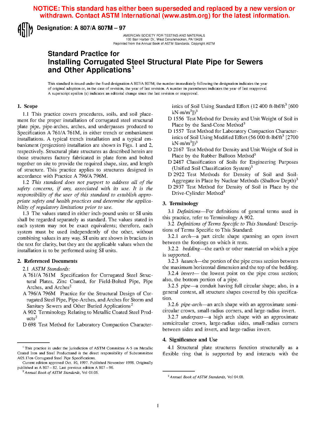 1.1 This practice primarily covers procedures, soils, and soil placement for the proper installation of corrugated steel structural plate pipe, pipe-arches, arches, and underpasses produced to Specification A761/A761M, in either trench or embankment installations. This practice also covers installation of structural plate for alternative uses that do not involve backfilling or soil-structure interaction.