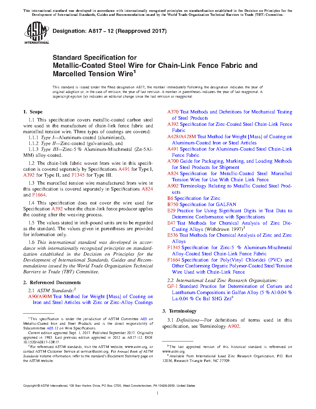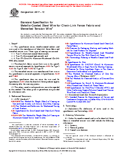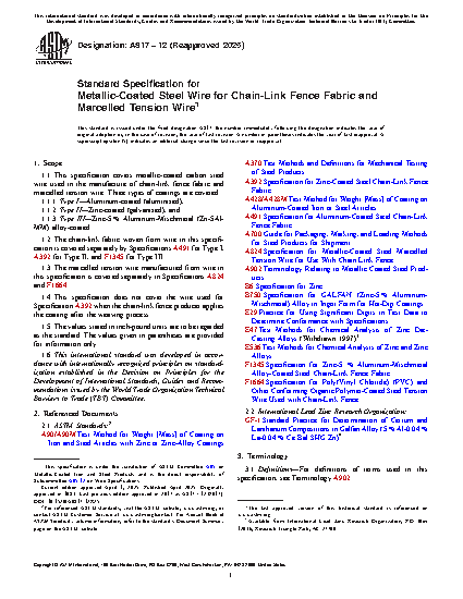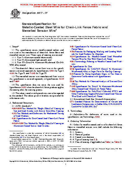 1.1 This specification covers metallic-coated carbon steel wire used in the manufacture of chain-link fence fabric and marcelled tension wire. Three types of coatings are covered: