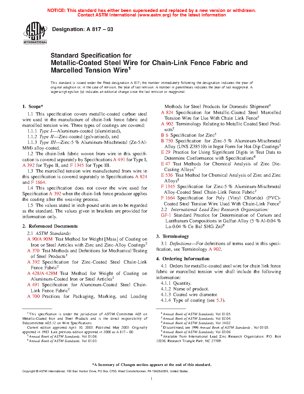 1.4 This specification does not cover the wire used for Specification A392 when the chain-link fence producer applies the coating after the weaving process.